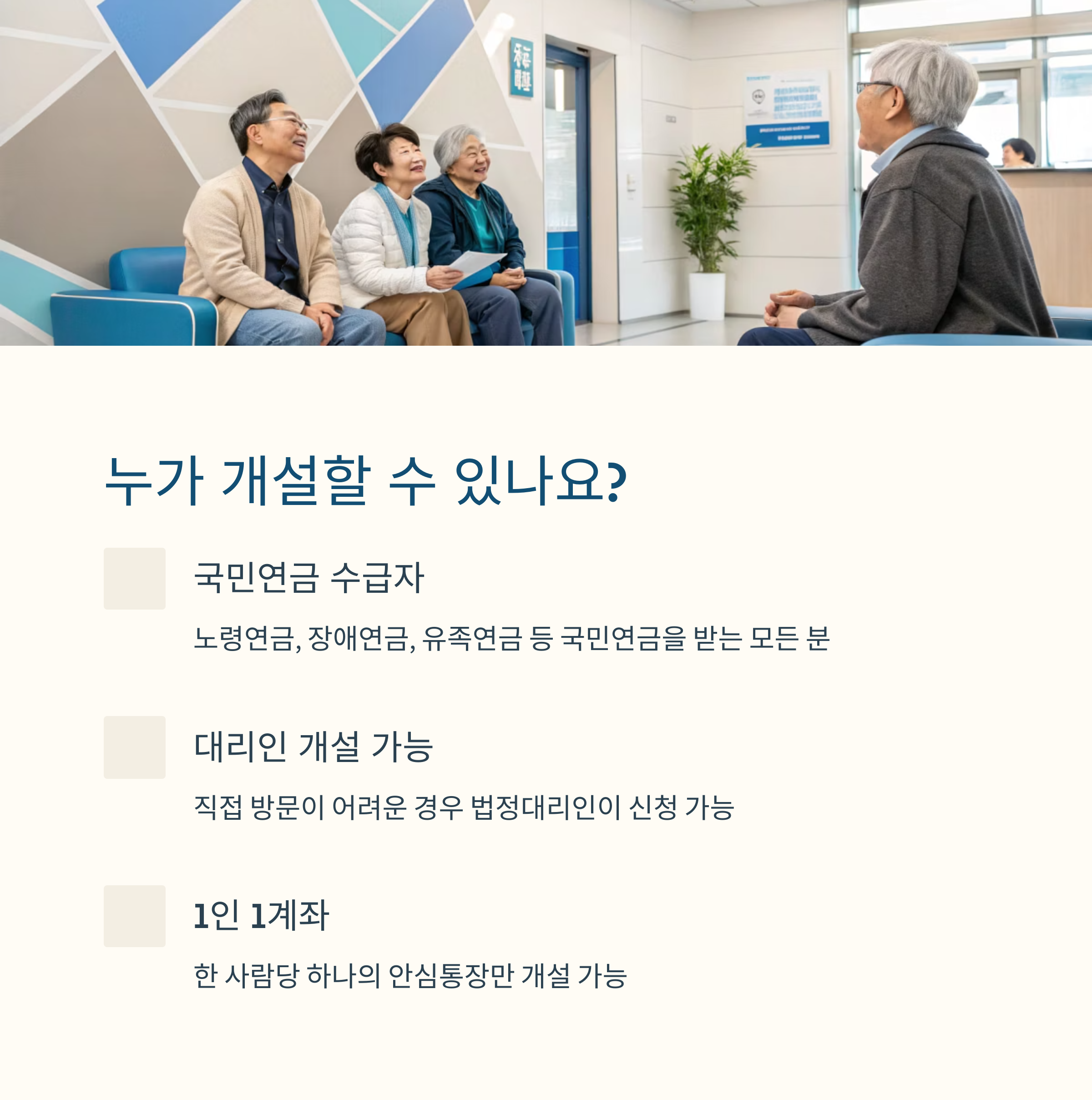 국민연금 안심통장은 모든 연금 수급자가 개설할 수 있는 건 아니에요. 주로 고령층, 즉 만 60세 이상의 국민연금 수급자가 주 대상이에요. 보이스피싱이나 금융사기에 취약한 연령대가 주 타깃이기 때문에, 은행도 이 부분을 중점적으로 보고 있어요.