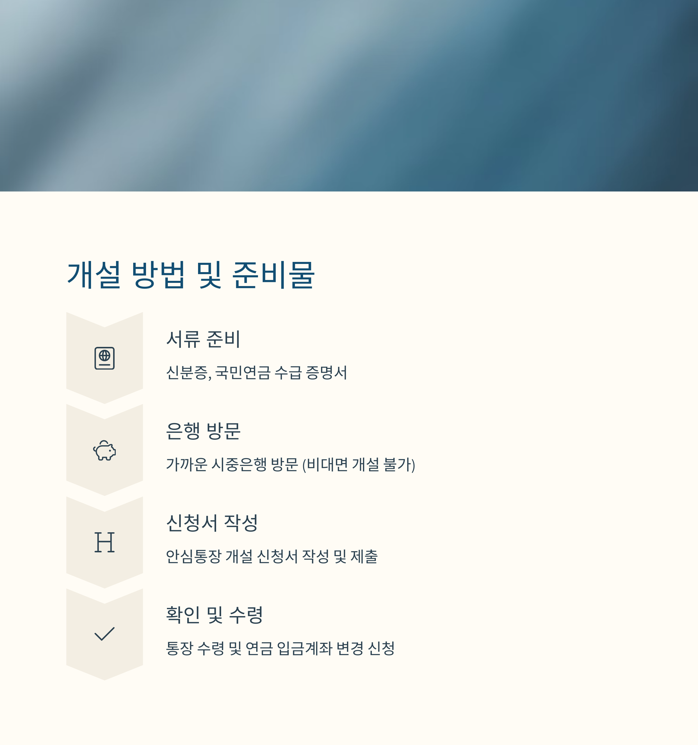 국민연금 안심통장은 개설 절차가 복잡하지 않아요. 다만 일반 통장과는 다르게 신분 확인과 연금 수급 여부 확인이 필수이기 때문에 몇 가지 서류는 꼭 준비해야 해요. 기본적으로는 은행 창구에서 직접 신청하는 방식이기 때문에 온라인 신청은 어렵고, 방문이 필요해요.