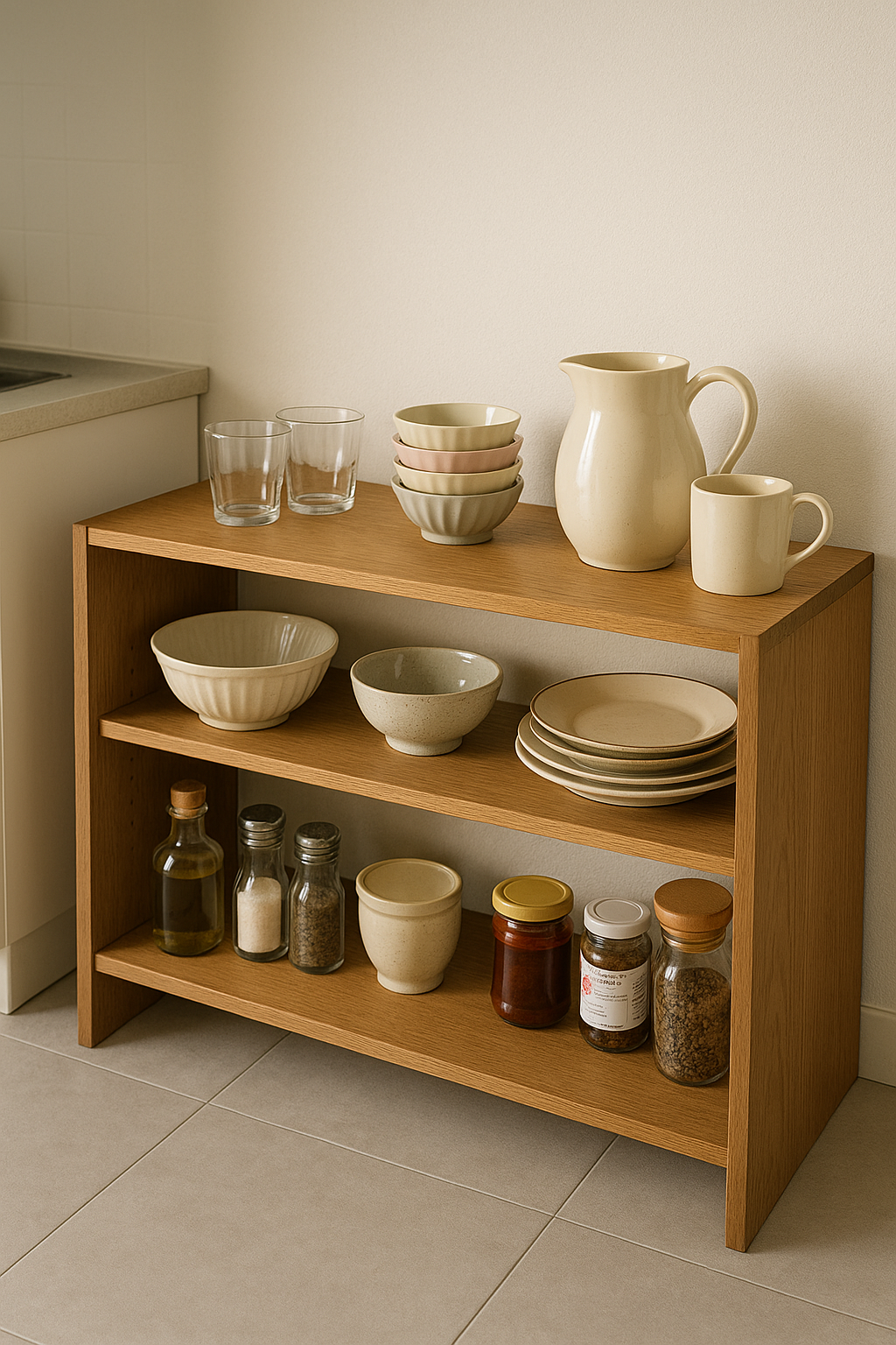 오픈형 책장은 주방 용품이나 식료품을 보관하는 주방 수납장으로도 훌륭하게 활용될 수 있습니다.