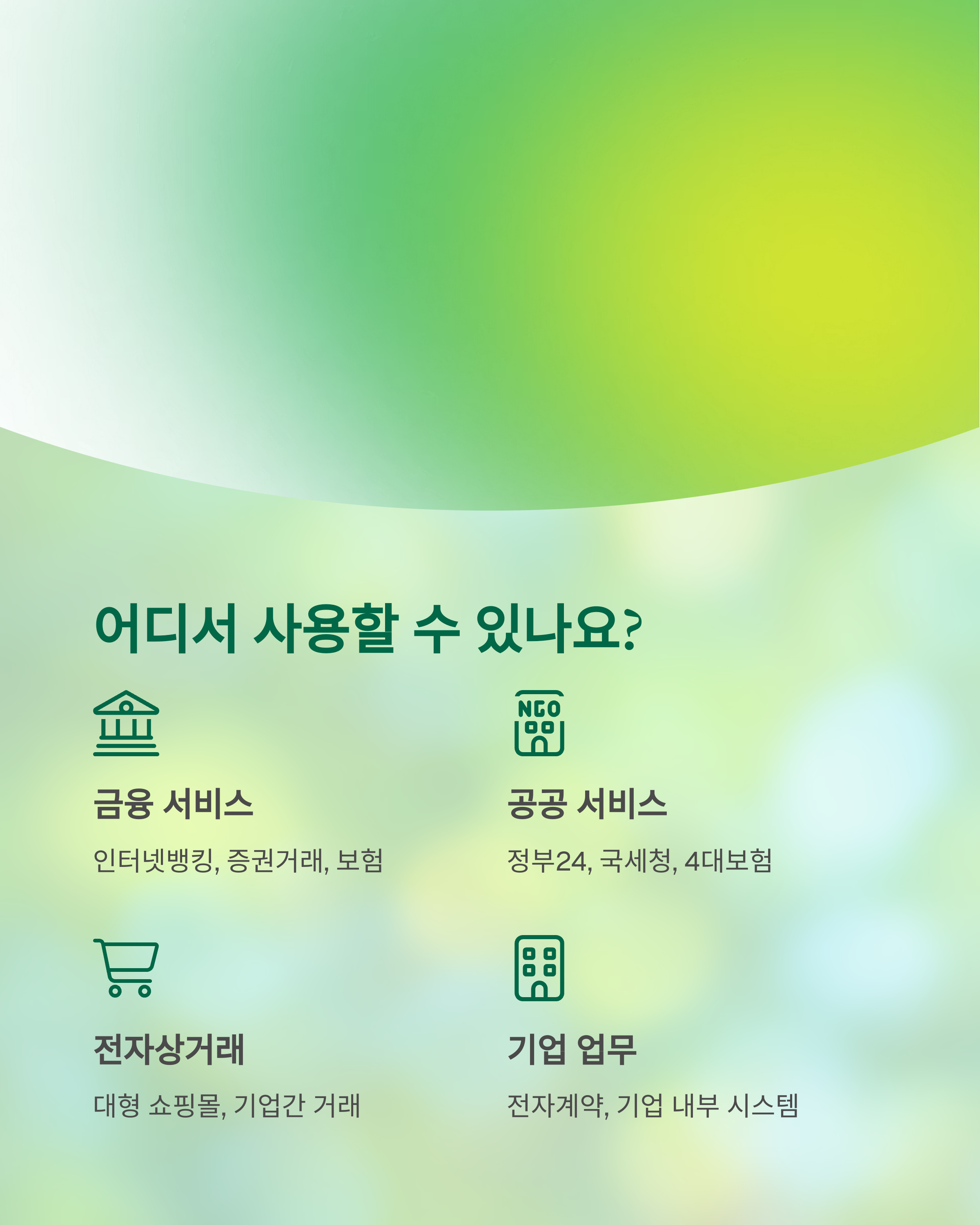 | 사용 가능 범위 | 공공기관, 은행, 법원 등 모든 분야 | 제한적(자사 플랫폼 중심) |