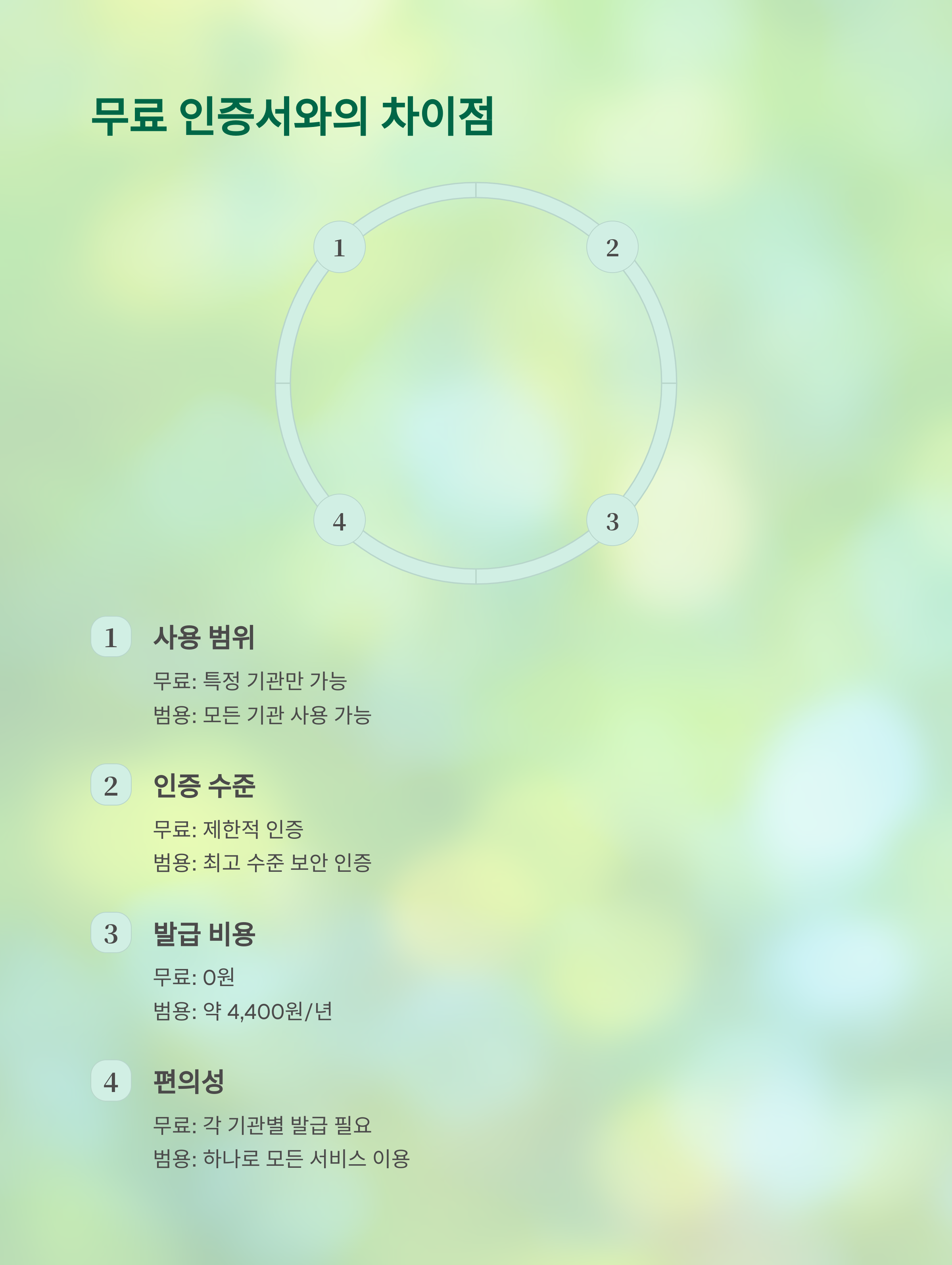 보안 수준도 차이가 있어요. 범용공인인증서는 발급 시 실명 인증과 신분증 확인 과정을 거치기 때문에 사용자 확인 절차가 훨씬 엄격해요. 반면 무료 인증서는 간편하지만 휴대폰 번호나 간이 인증 절차만 거치는 경우가 많아요.
