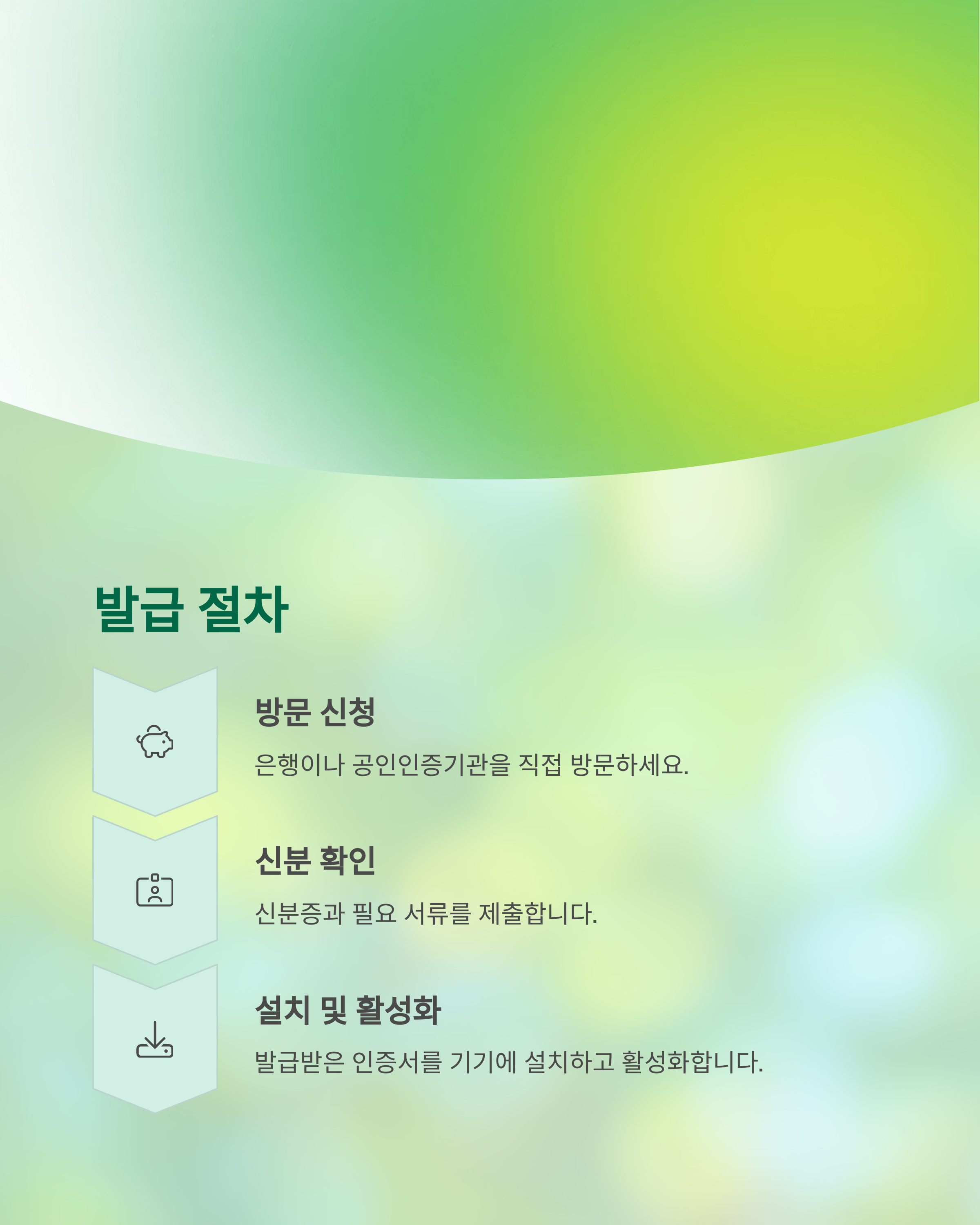 인터넷 신청도 가능하지만, 최초 발급일 경우에는 신분증을 지참해서 가까운 은행 지점에 직접 방문해야 해요. 기업 인증서라면 사업자등록증 사본과 위임장도 필요해요. 보통 10분 정도면 발급이 완료돼요.