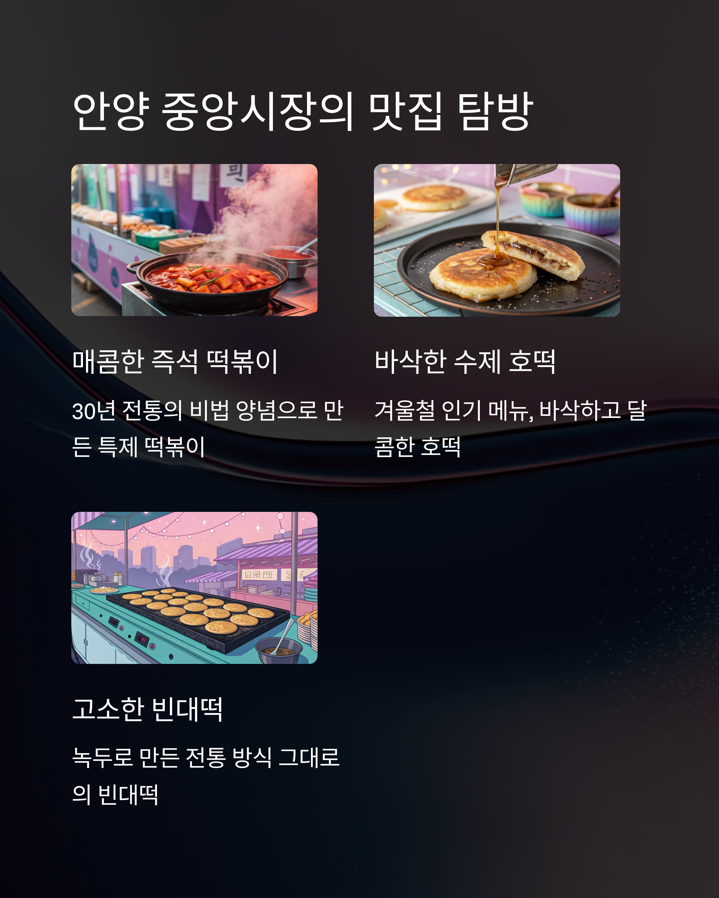 안양 중앙시장은 특히 저녁에 가면 분위기가 더 좋아요. 해가 지면 시장 특유의 불빛과 향이 더해져 묘하게 따뜻하고 아늑한 기분이 들거든요. 혼밥도 가능하고, 가족끼리 외식하러 오기에도 딱 좋은 장소랍니다.