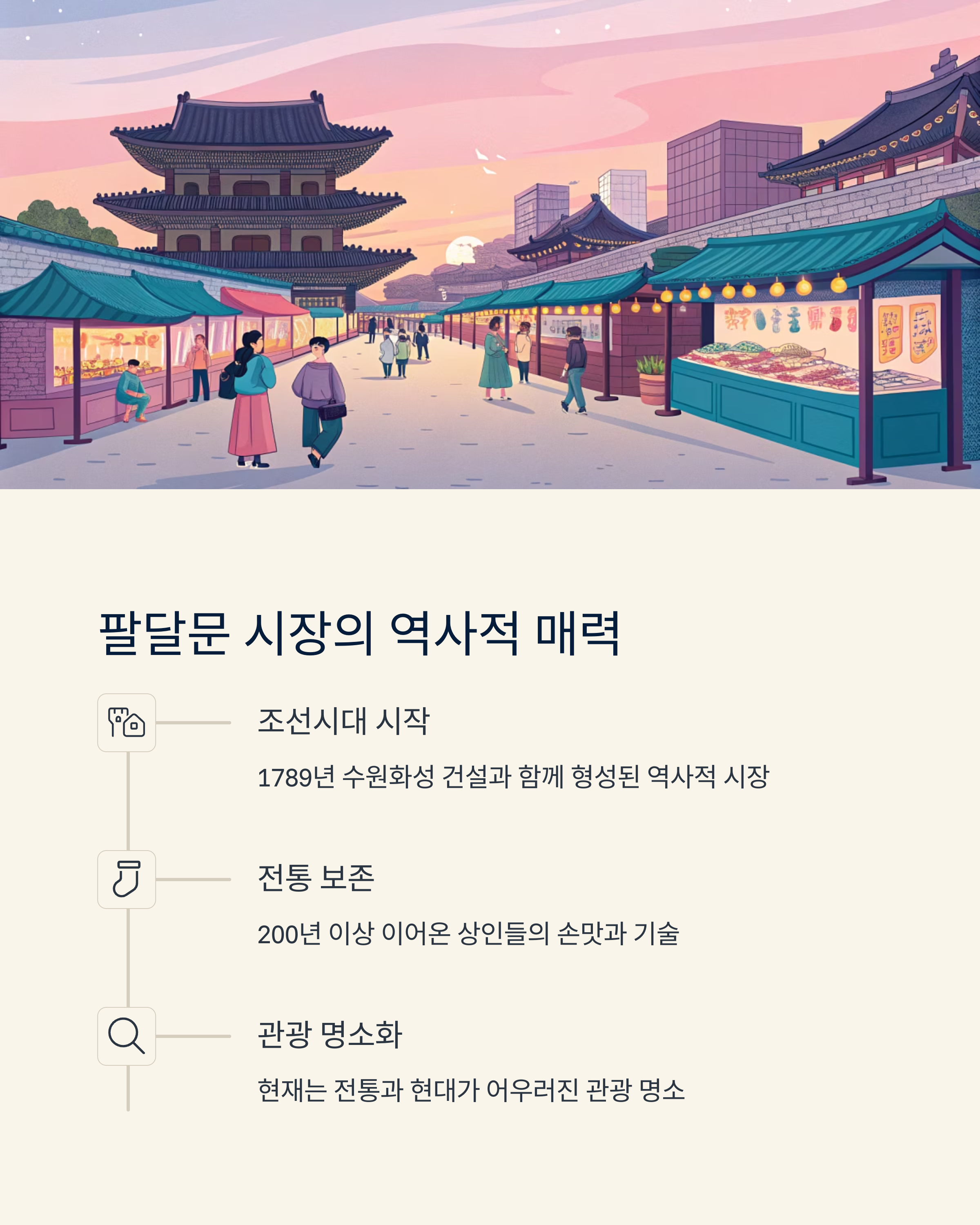 팔달문시장은 수원 화성의 팔달문 바로 옆에 위치한, 경기도를 대표하는 역사 깊은 전통시장이에요. 이곳은 조선시대부터 장이 서던 자리로, 현재까지도 수원 시민들의 생활 속에 깊숙이 뿌리내리고 있는 장소랍니다. 시장에서 장을 보다 보면 문화재를 함께 감상하는 색다른 경험도 할 수 있어요!
