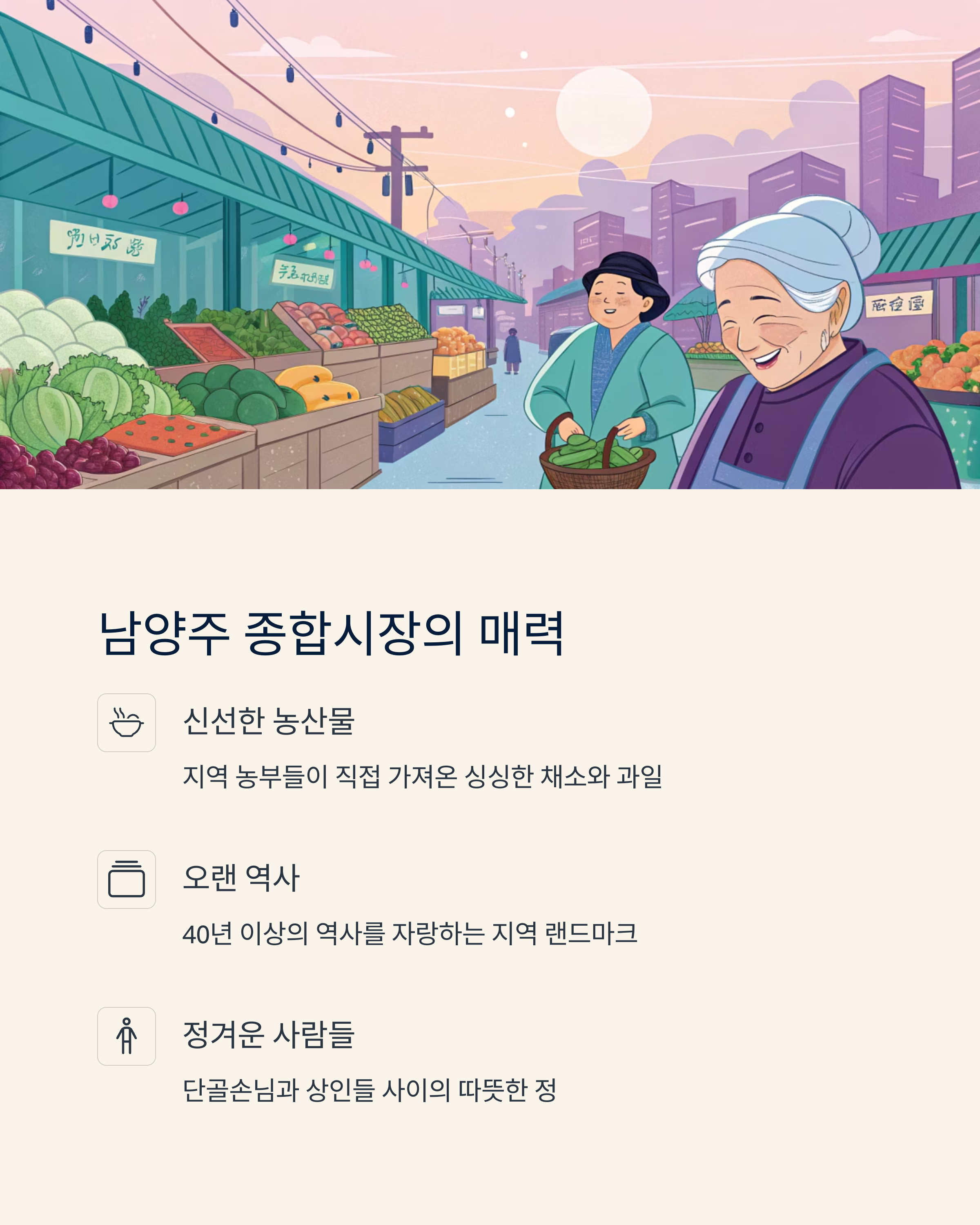 남양주 종합시장은 경기도 동북부에서 가장 활발한 재래시장 중 하나예요. 이 시장은 1970년대 후반에 형성되기 시작했고, 현재는 200여 개에 가까운 점포가 밀집해 있어요. 주변에는 주택가와 학교가 밀접하게 붙어 있어서 지역 주민들의 실생활과 밀접하게 연결되어 있답니다.