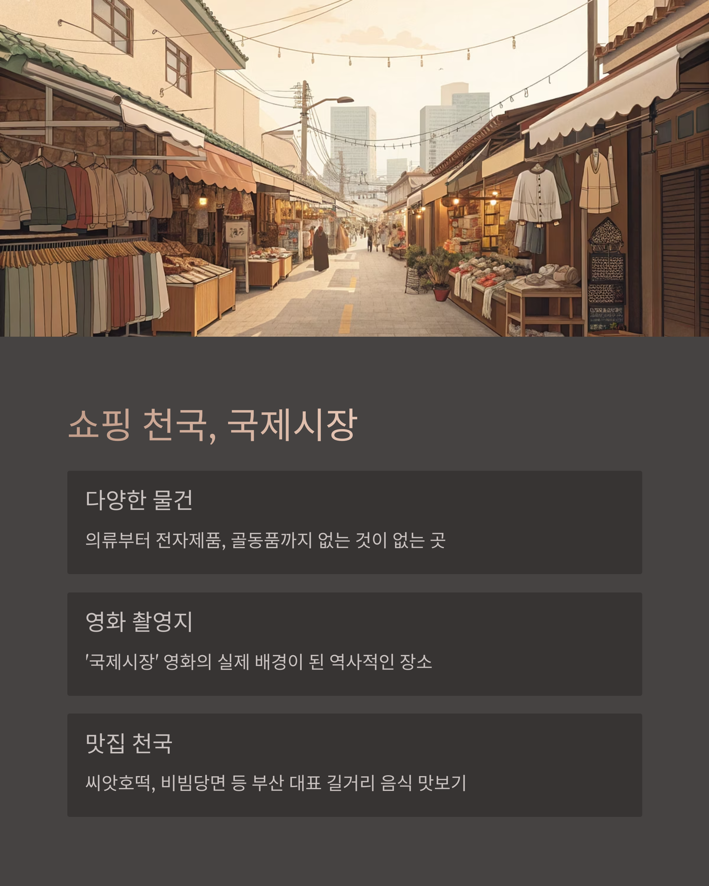 국제시장은 부산에서 가장 오래된 시장 중 하나로, 6.25 전쟁 직후 피란민들이 생계를 위해 시작한 시장이에요. 그래서인지 '피난민의 삶과 희망'이 곳곳에 묻어있는 특별한 장소죠. 본래 이름은 '도떼기시장'이었는데, 외국 물품이 많이 들어오면서 국제시장이라는 이름이 붙게 되었어요.