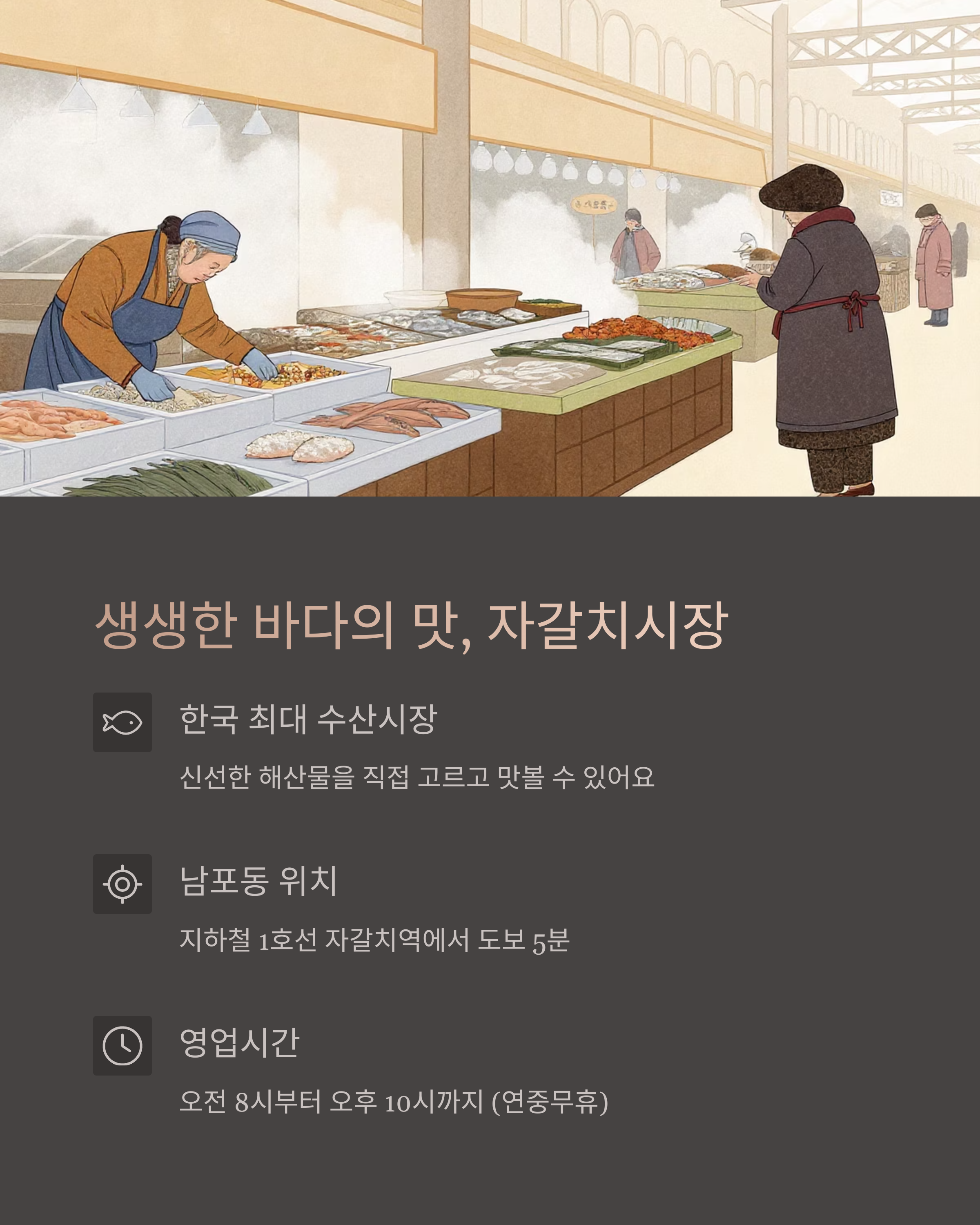 신선한 해산물은 물론, 횟집들도 즐비해서 원하는 해산물을 골라 바로 회를 떠서 먹을 수도 있어요. 특히 자갈치 아지매로 불리는 상인들의 푸근한 인심은 이 시장의 또 다른 매력이죠. 입구만 들어서도 "자~ 이리 와봐~ 회 싸게 해줄게~"라는 소리가 들려올 정도예요.