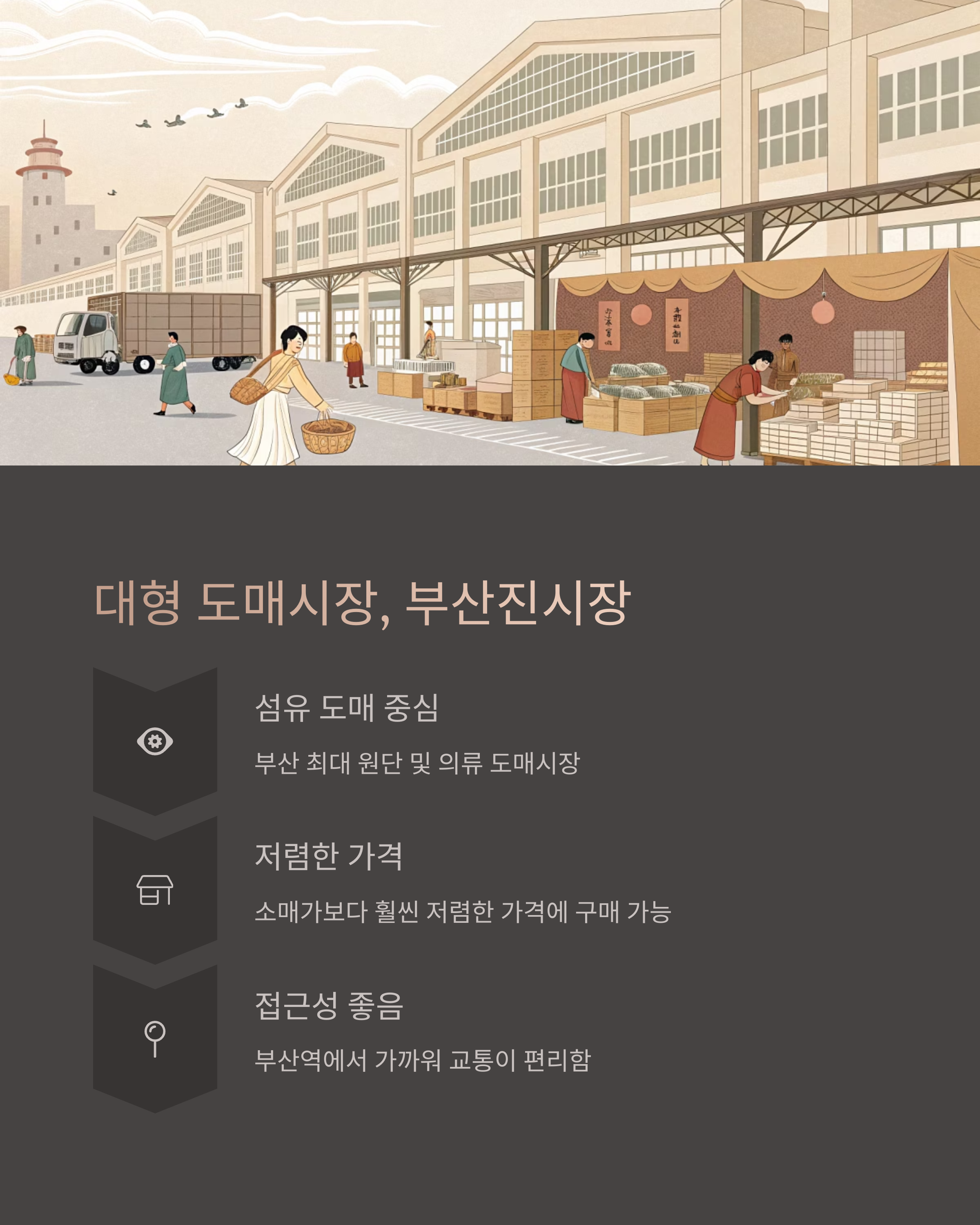 부산진시장은 부산 패션의 중심지라고도 불려요. 의류, 원단, 부자재부터 액세서리까지 없는 게 없다는 말이 나올 정도로 패션 관련 상품이 정말 다양하게 준비돼 있어요. 디자이너들이 자주 찾는 곳이기도 하죠.