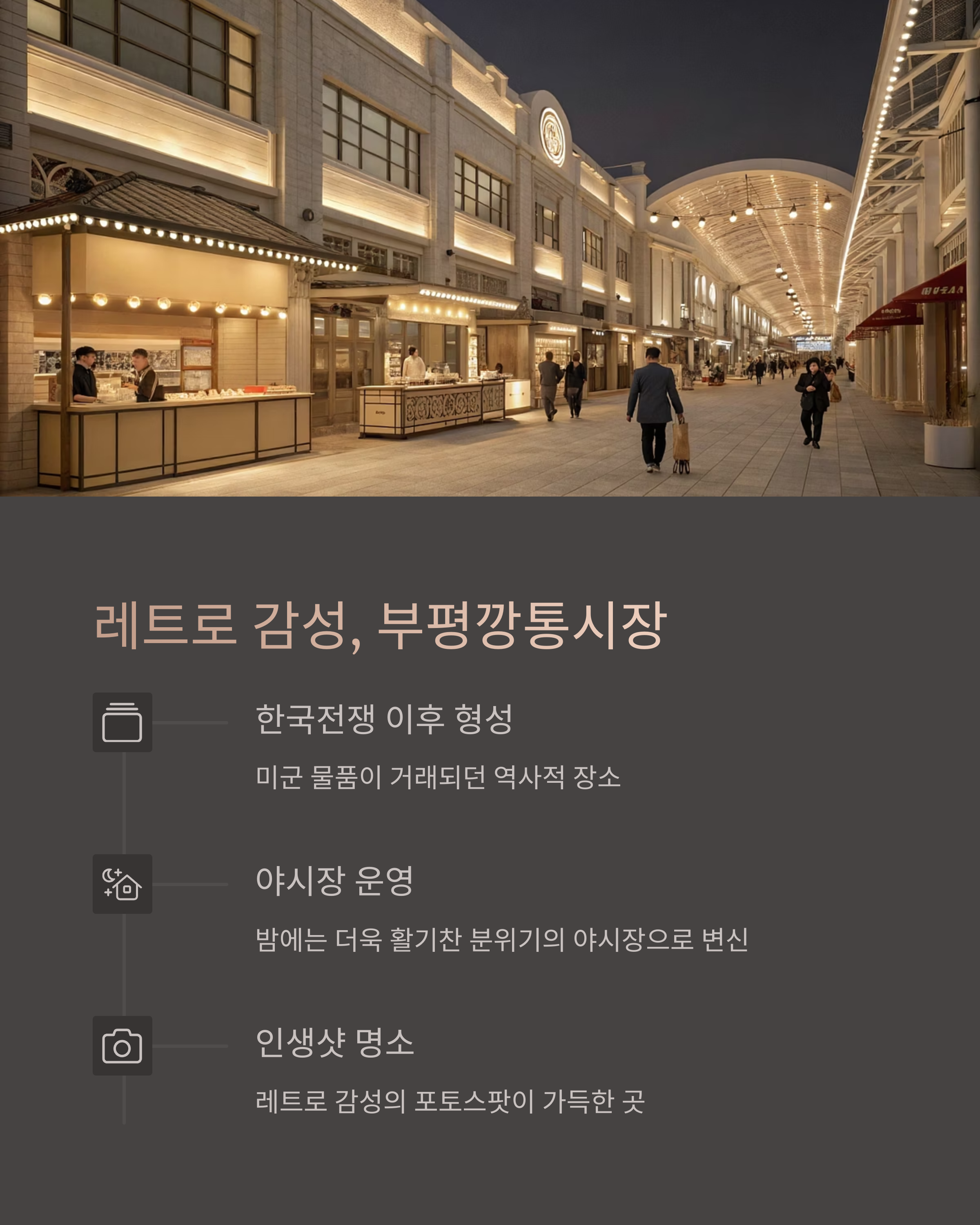 부평깡통시장은 이름부터 독특하죠? 이곳은 6.25 전쟁 이후 미군 부대에서 나온 통조림을 팔던 곳에서 유래된 시장이에요. ‘깡통시장’이라는 이름은 그래서 붙여졌답니다. 당시엔 통조림이 귀했기 때문에 인기가 정말 많았다고 해요.