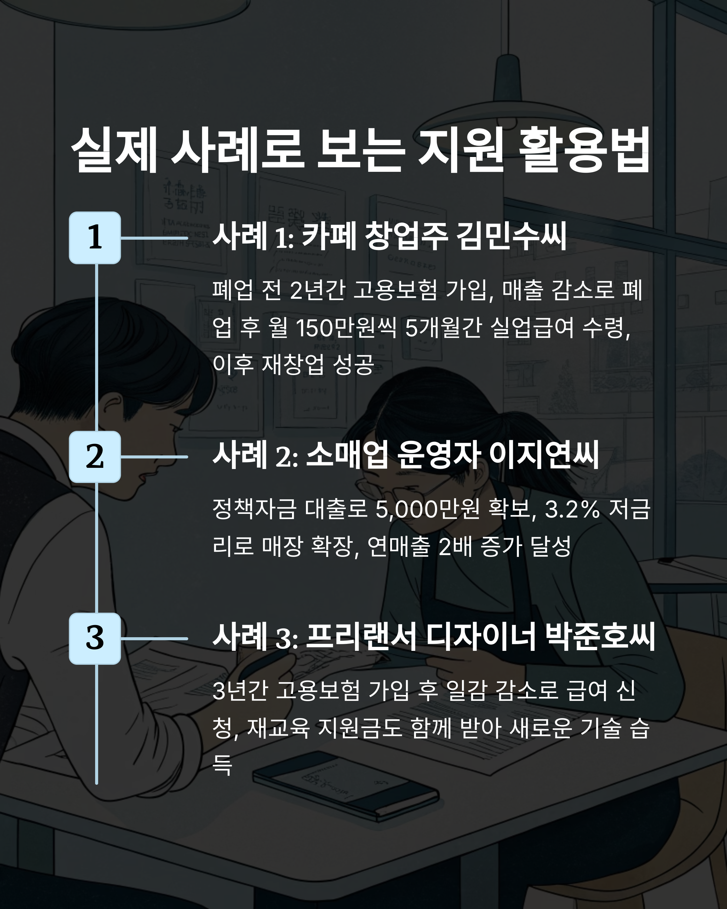 제도는 알겠는데, 실제로 누가 어떻게 활용했는지가 가장 궁금하죠? 이번에는 자영업자가 실제로 고용보험이나 대출 제도를 어떻게 활용했는지 생생한 사례를 소개할게요. 현실적인 사례를 통해 제도의 실효성과 접근성을 쉽게 이해할 수 있을 거예요.