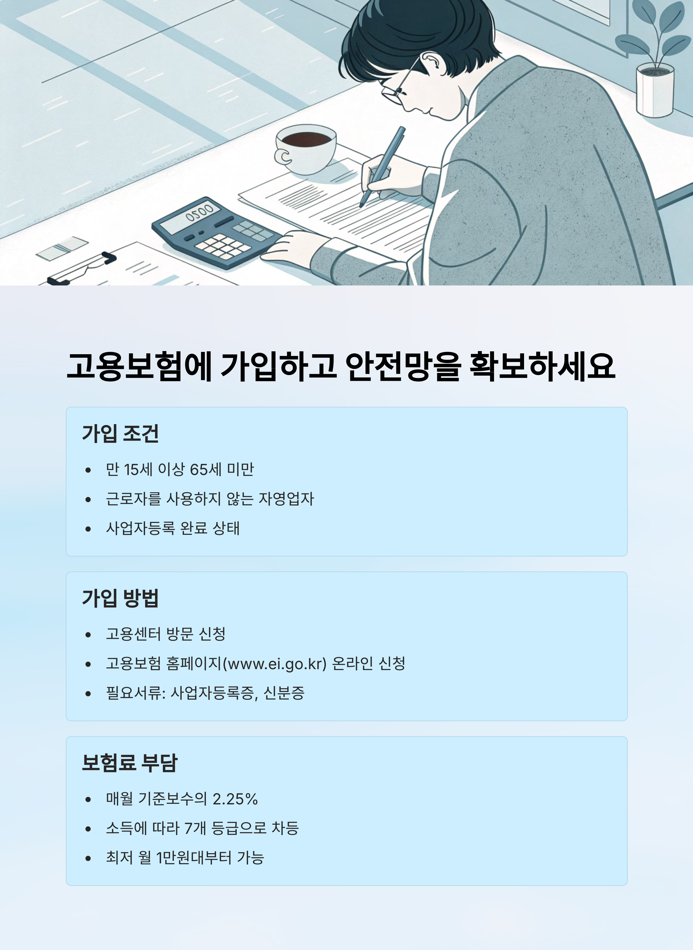 자영업자가 고용보험에 가입하려면 먼저 ‘피보험자격’을 취득해야 해요. 본인이 직접 신청해야 하고, 사업 개시일로부터 5년 이내인 경우에만 가입 가능해요. 사업자등록증, 매출 증빙 서류, 건강보험 자격확인서 등이 필요하고, 관할 근로복지공단 지사나 고용노동부 고용보험 홈페이지에서 접수할 수 있어요.