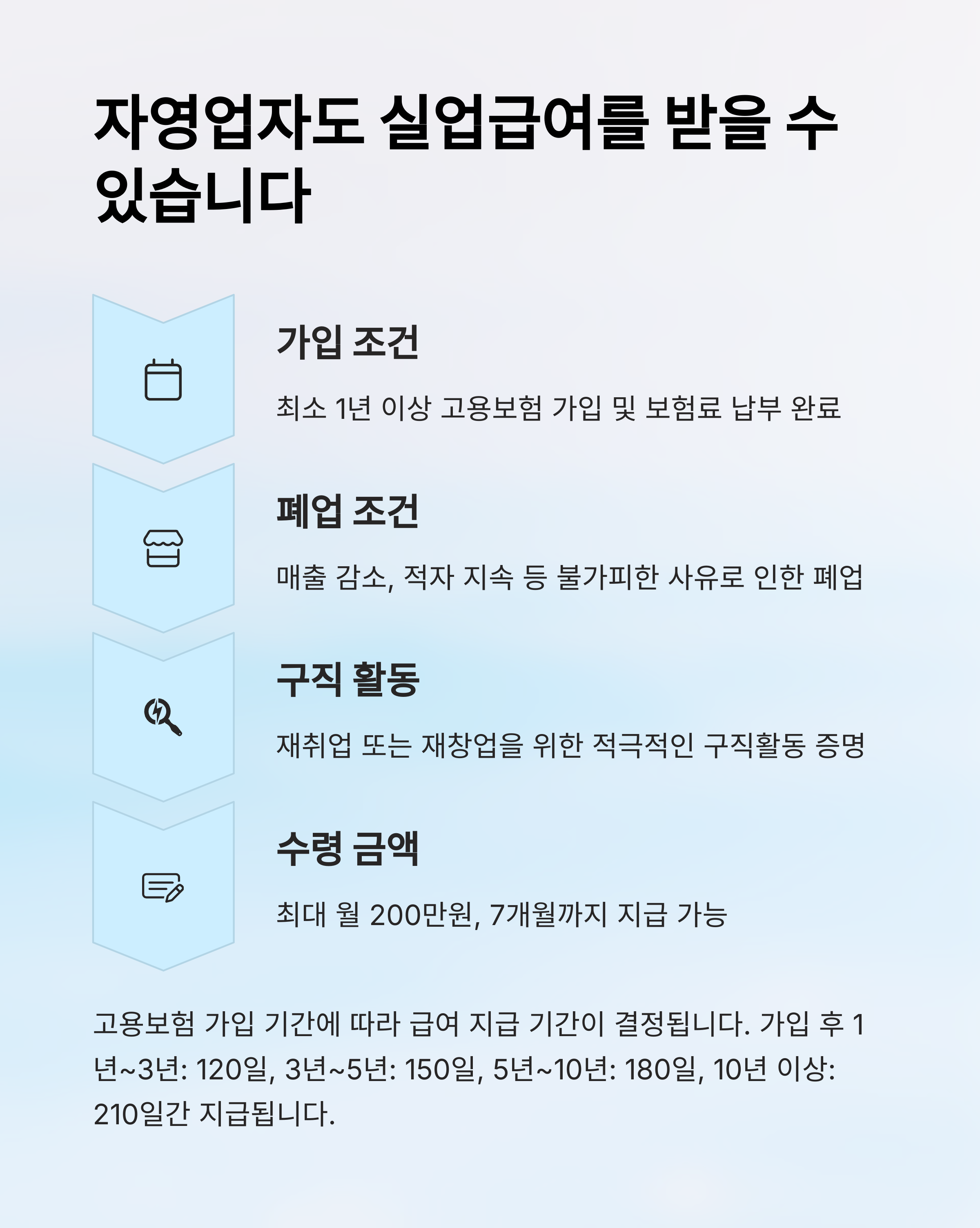 직장인의 경우, 고용주가 자동으로 고용보험에 가입해주고 매달 급여에서 보험료가 자동으로 공제돼요. 해고나 계약 종료 시 자동으로 실업급여 대상이 되며, 구직활동만 하면 대부분 수급이 가능하죠. 반면 자영업자는 스스로 보험 가입을 선택하고, 폐업이라는 확정적인 상태가 돼야만 실업급여를 받을 수 있어요.