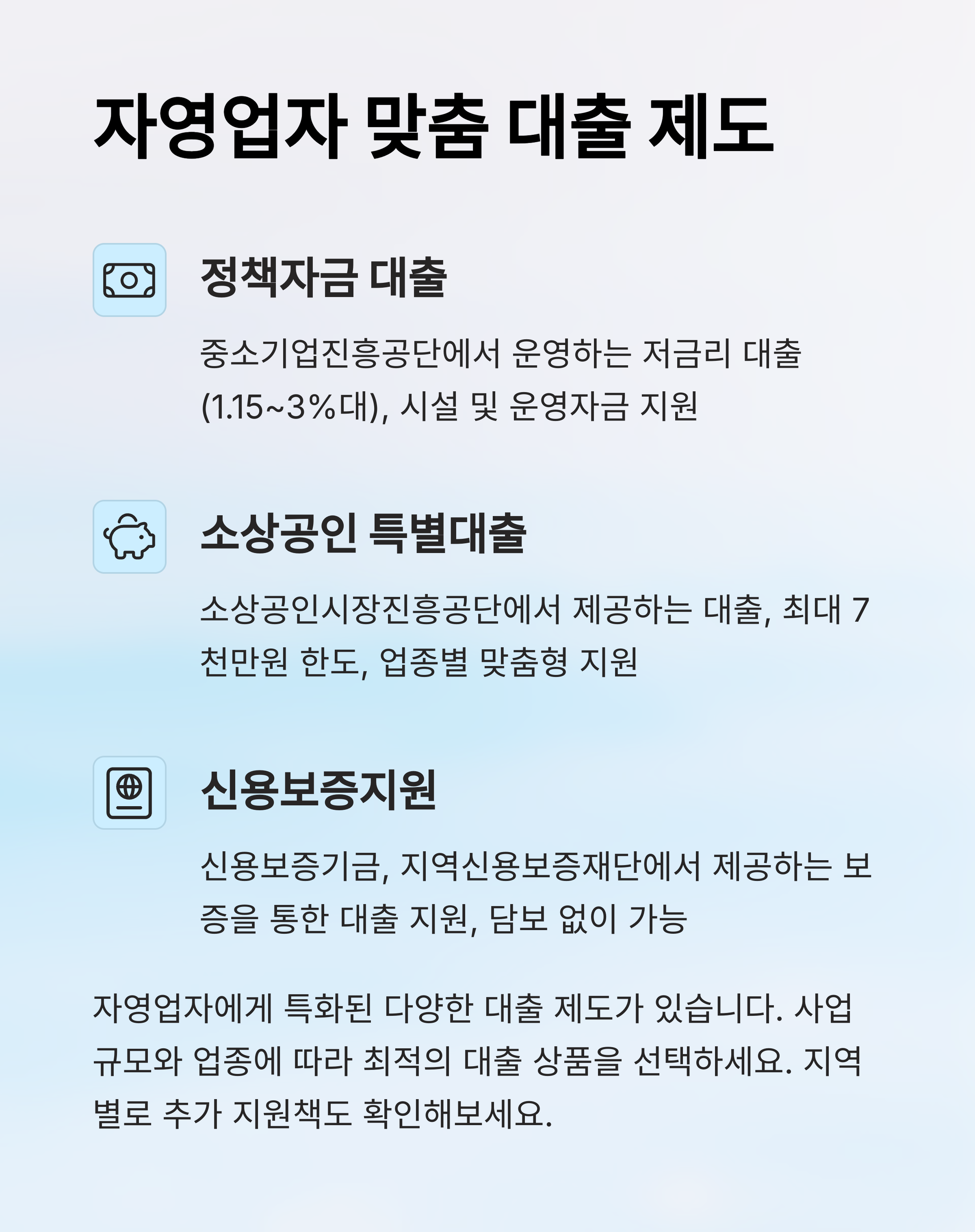 2025년 현재, 자영업자가 받을 수 있는 대표적인 대출 상품에는 '소상공인 정책자금', '지역신용보증재단 보증대출', '신용회복위원회 희망대출', '햇살론15', '새희망홀씨' 등이 있어요. 각 상품은 신청 자격, 대출 한도, 금리, 상환 조건이 다르기 때문에 비교 분석이 필수예요.