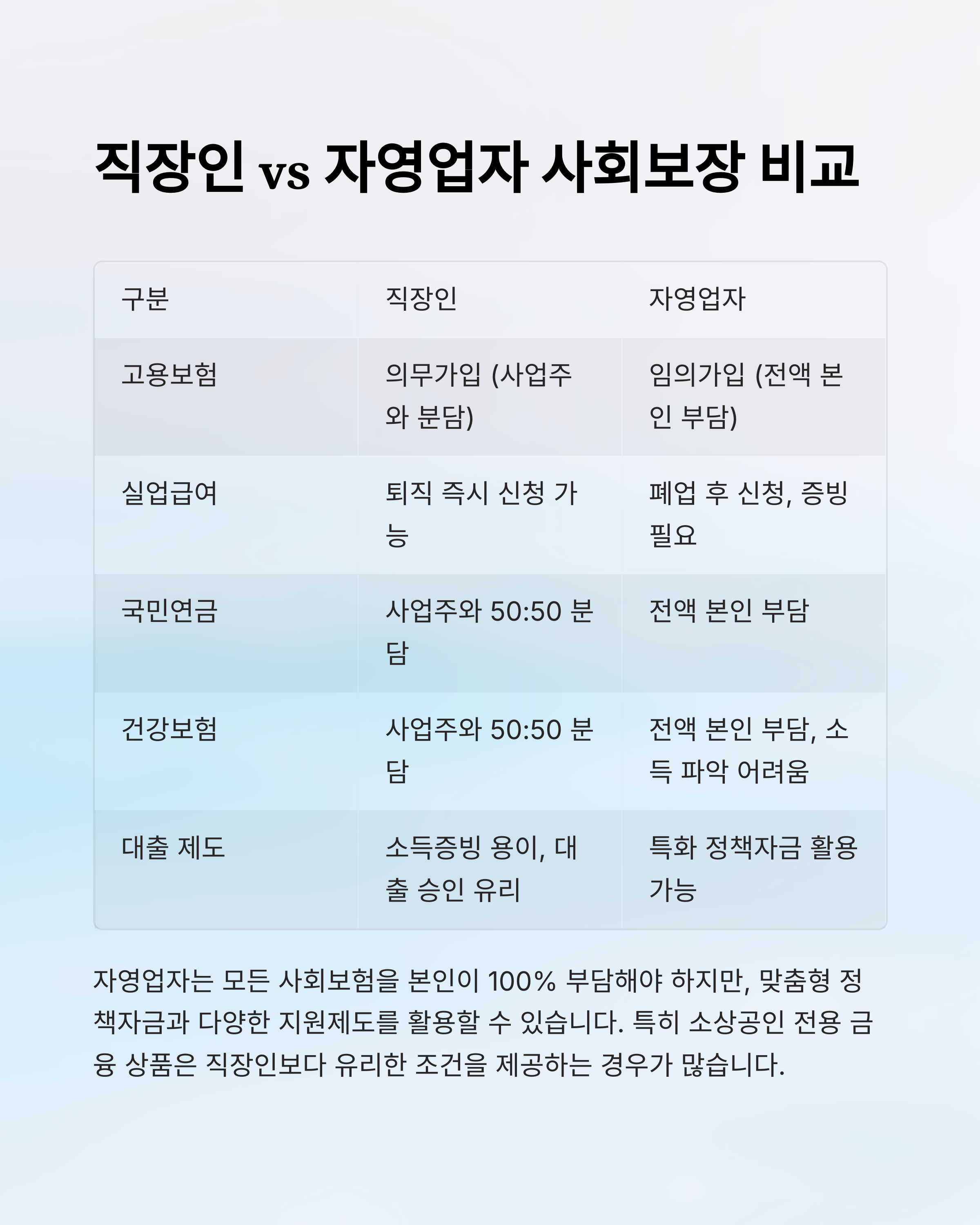 또한 직장인은 고용보험 외에도 국민연금, 건강보험, 산재보험 등 4대 보험 혜택을 안정적으로 받을 수 있어요. 자영업자도 해당 보험에 개별 가입할 수 있지만, 보험료 전액을 본인이 부담해야 하기 때문에 현실적으로는 부담이 크답니다. 이 때문에 자영업자는 보험 사각지대에 놓이기 쉬워요.