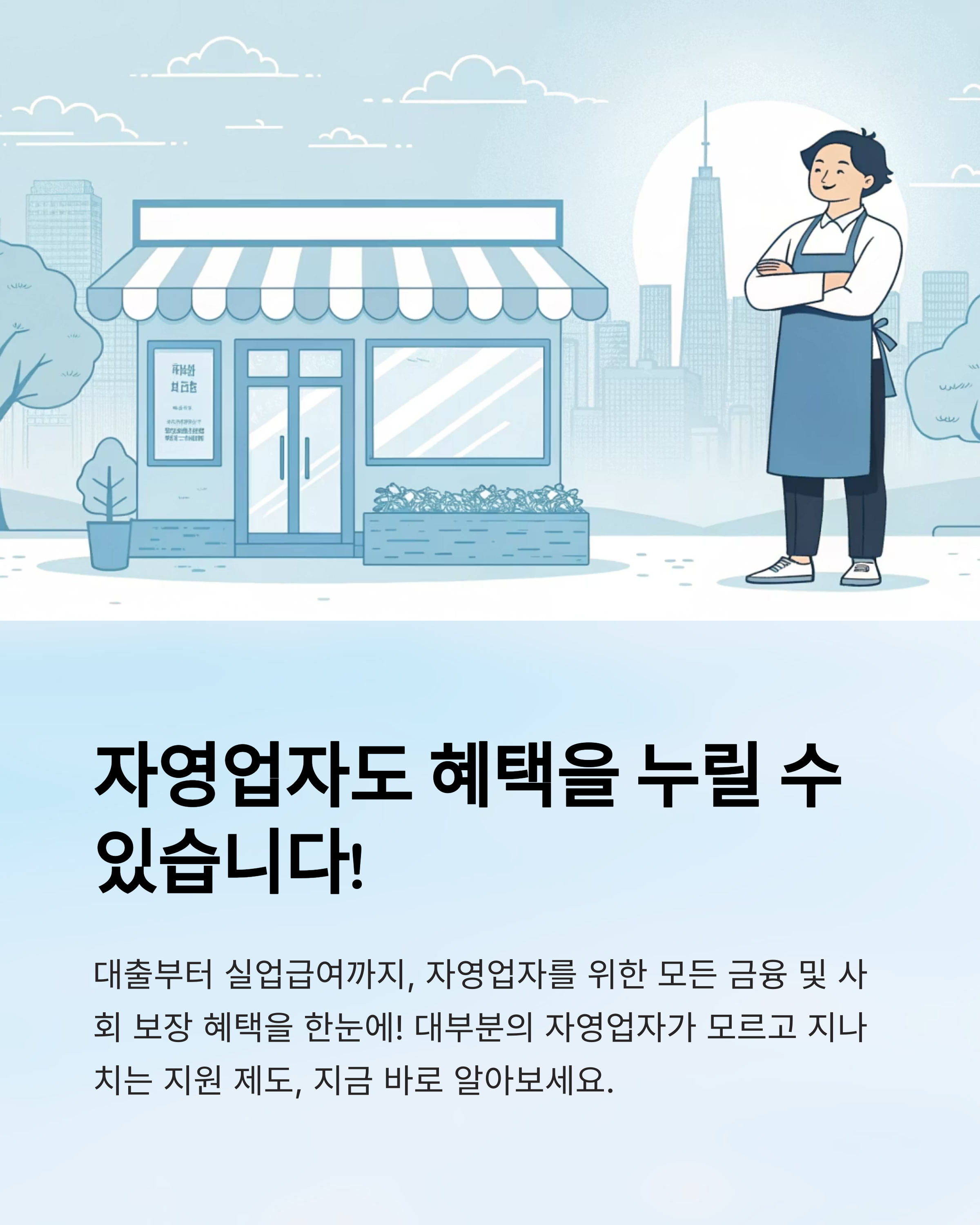 많은 자영업자분들이 “실업급여는 직장인들만 받을 수 있는 거 아니야?”라고 오해하시는데요, 사실 자영업자도 고용보험에 가입하고 일정 요건을 충족하면 실업급여를 받을 수 있어요. 제가 생각했을 때 이건 꼭 많은 분들이 알아야 할 유익한 정보라고 생각해요. 대출도 마찬가지로 일반 금융기관뿐 아니라 정부 지원 상품까지 폭넓게 제공되고 있답니다.