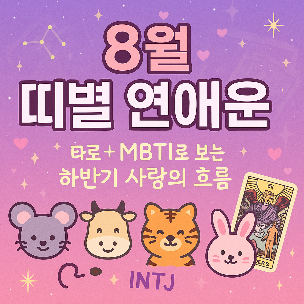 2025년 8월, 태양은 정점을 지나 서서히 가을로 향하는 길목에 들어섰어요. 이런 시기에는 감정이 유난히 예민해지기도 하고, 새로운 인연에 대한 갈망이 커지는 때이기도 하답니다. 그래서 오늘은 띠별 운세와 함께 타로카드, 그리고 요즘 가장 인기 있는 MBTI 유형까지 활용해서 당신의 연애 흐름을 꿰뚫어보려 해요.