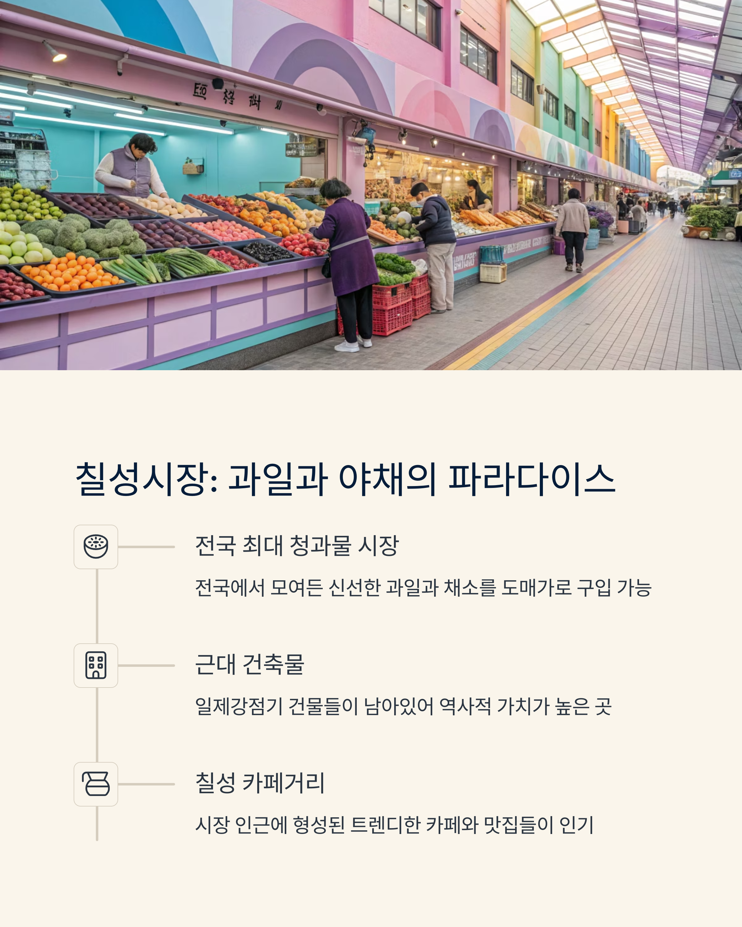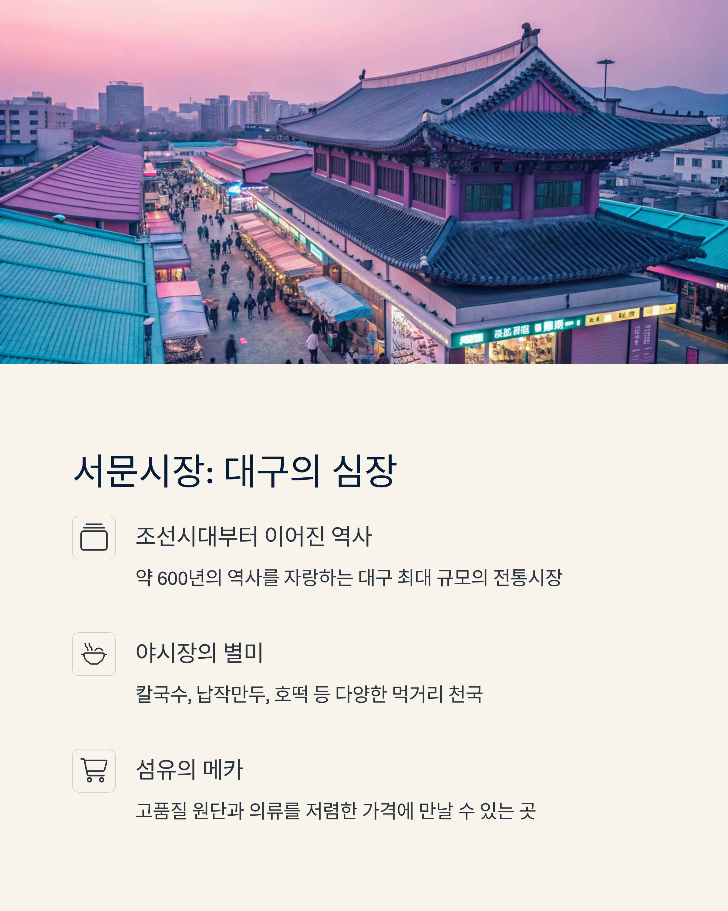 대구는 전통과 현대가 조화를 이루는 도시예요. 특히 시장 문화가 잘 살아 있어 골목마다 먹거리와 이야기가 넘쳐나요. 대구의 전통시장은 단순한 쇼핑 공간이 아니라, 대구 사람들의 삶과 역사가 녹아 있는 생활 문화 공간이기도 해요.