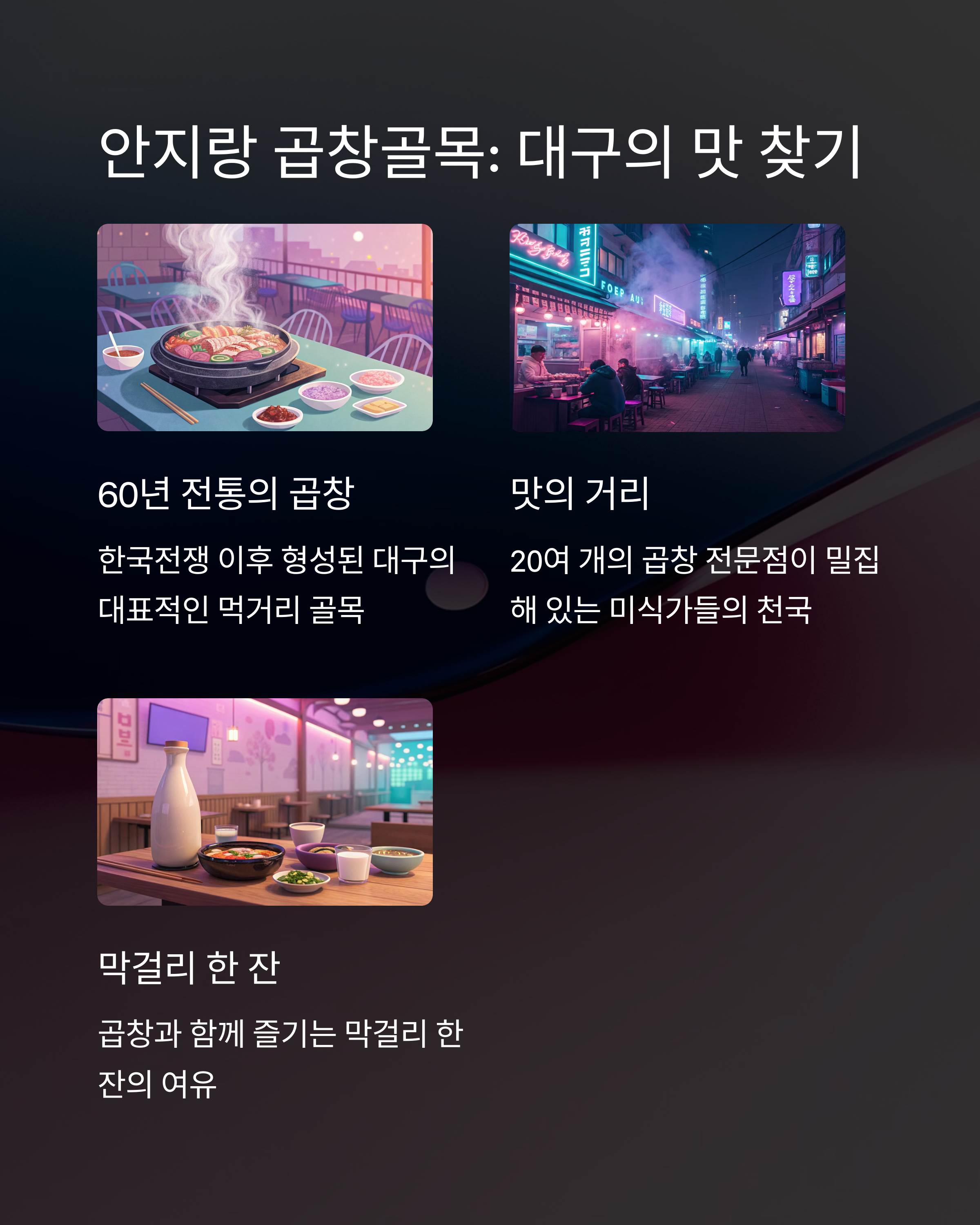 안지랑 곱창골목은 대구 먹거리 문화의 상징이자 전국에서 가장 유명한 곱창 명소예요. 이곳은 단순한 시장이 아니라 곱창으로만 이루어진 하나의 거리로, 약 50개가 넘는 곱창집이 줄지어 있어요. 대구사람들은 "곱창은 안지랑"이라고 말할 만큼 이 골목에 대한 자부심이 대단하답니다.