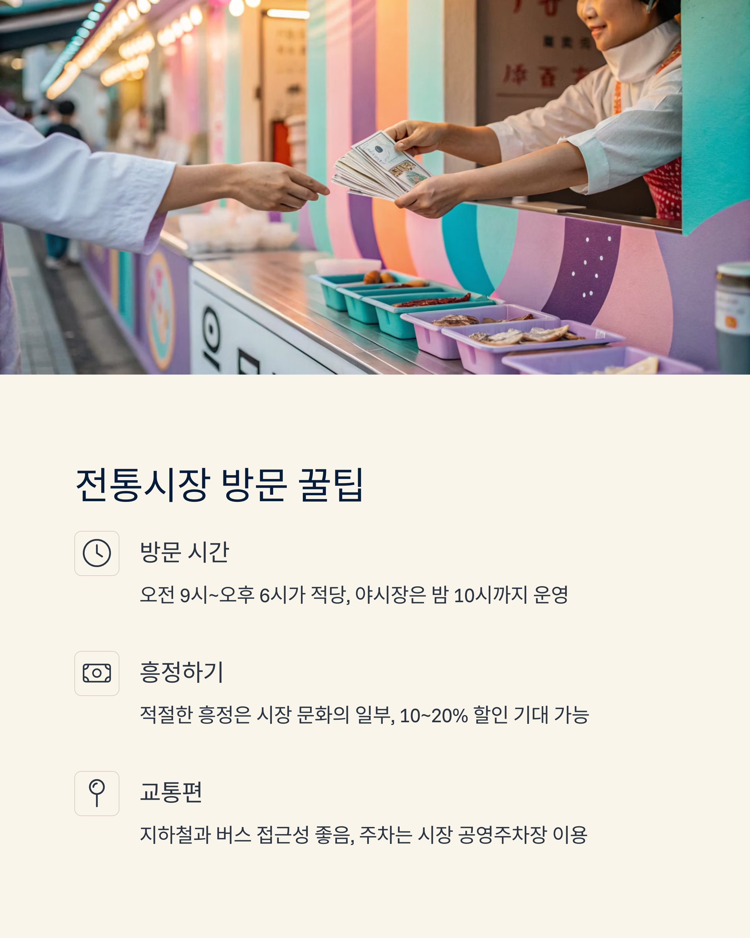 시장 내부는 정비가 잘 되어 있어서 다른 전통시장에 비해 위생적이고 현대적인 느낌도 받을 수 있어요. 물건 진열도 깔끔하고, 상인들이 가격을 솔직하게 안내해줘서 초보자도 편하게 쇼핑할 수 있어요.