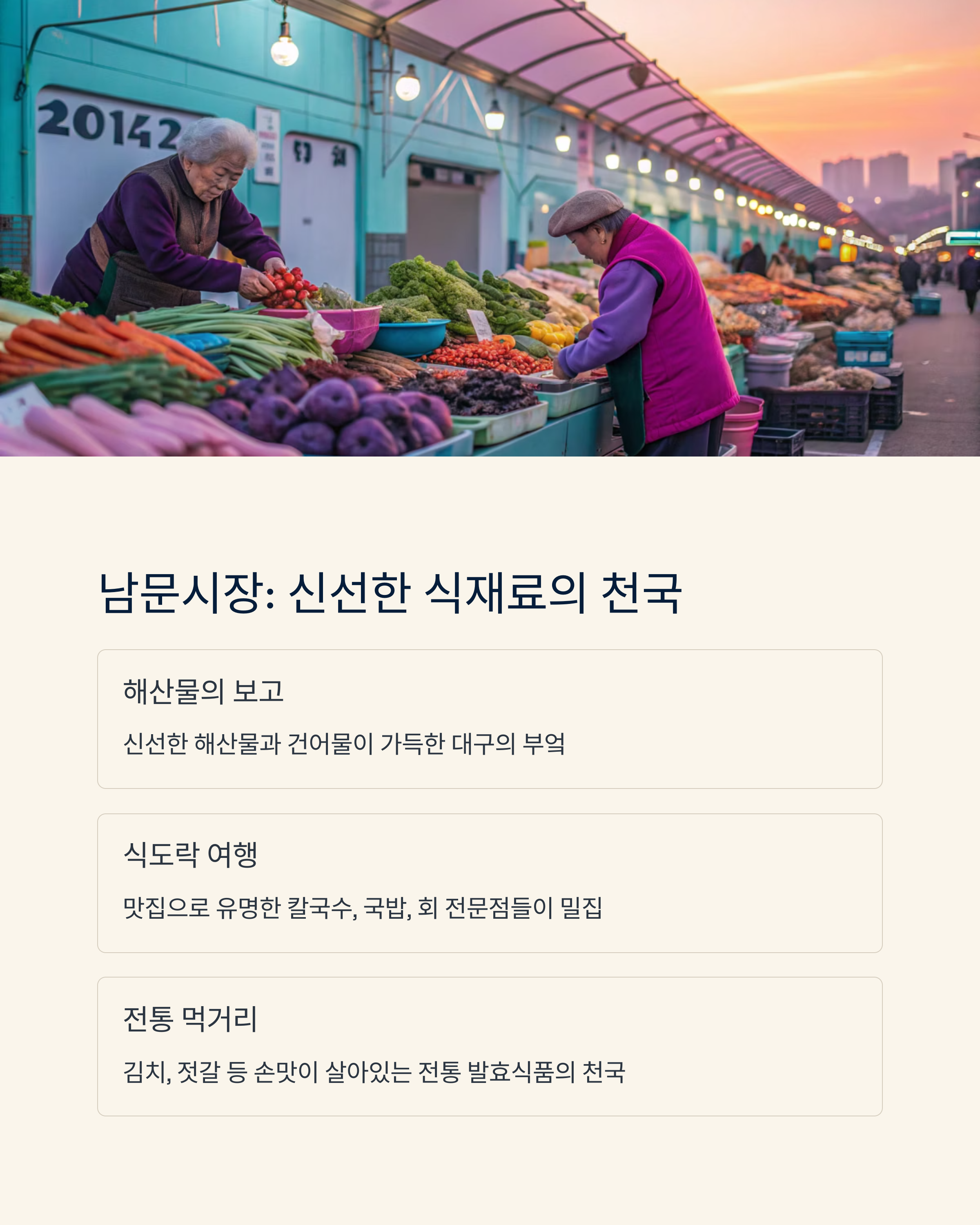 남문시장은 대구의 또 다른 일상적인 풍경을 마주할 수 있는 공간이에요. 유명세는 덜하지만, 진짜 전통시장의 정을 느끼고 싶다면 이곳은 놓치면 안 되는 명소예요.