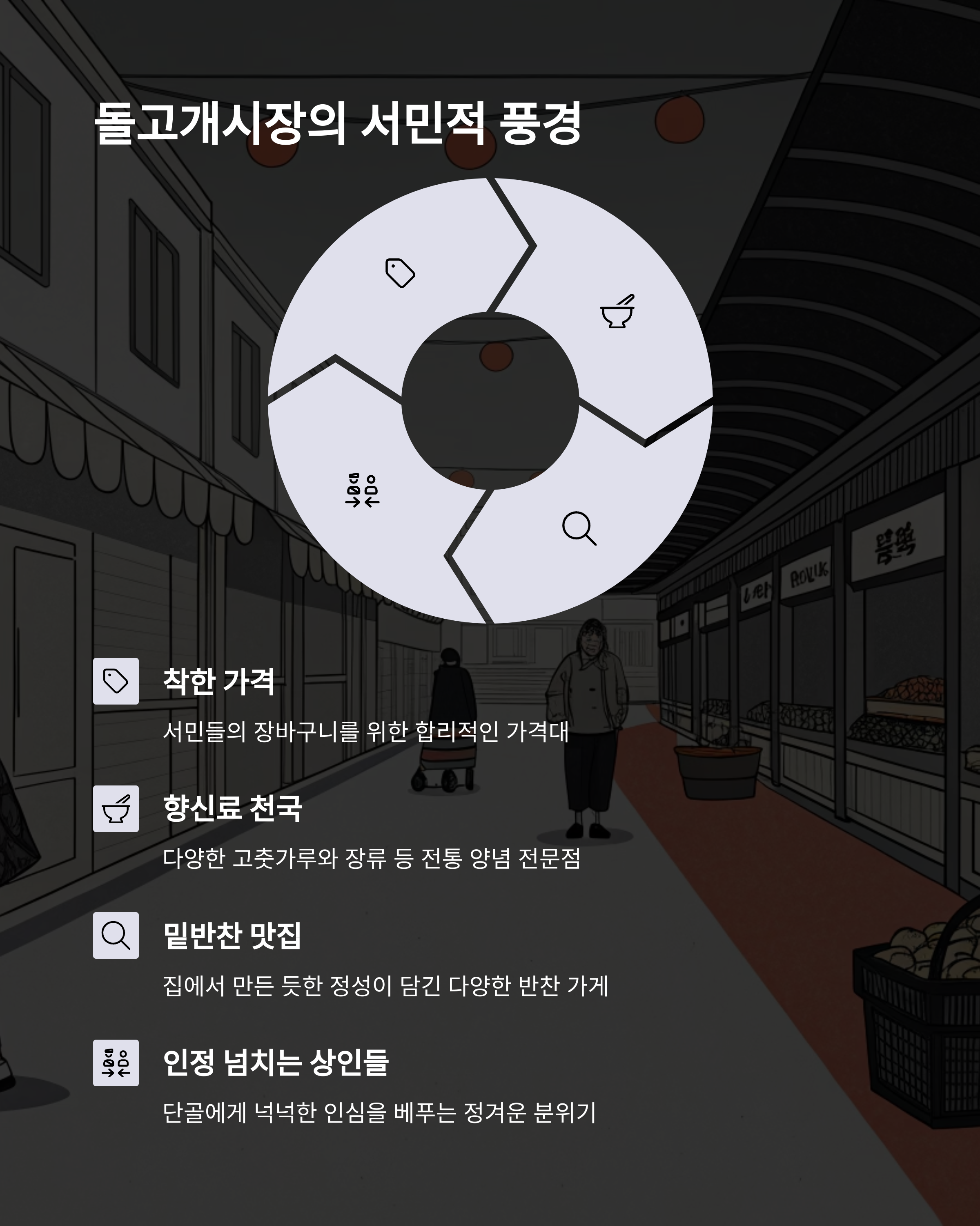 돌고개시장은 1970년대 중반부터 형성된 중형시장으로, 광주 지역 소상공인의 삶을 함께한 긴 역사를 자랑해요. 오래된 방앗간, 전통 찻집, 수선집 같은 정겨운 가게들이 아직도 영업 중이에요.