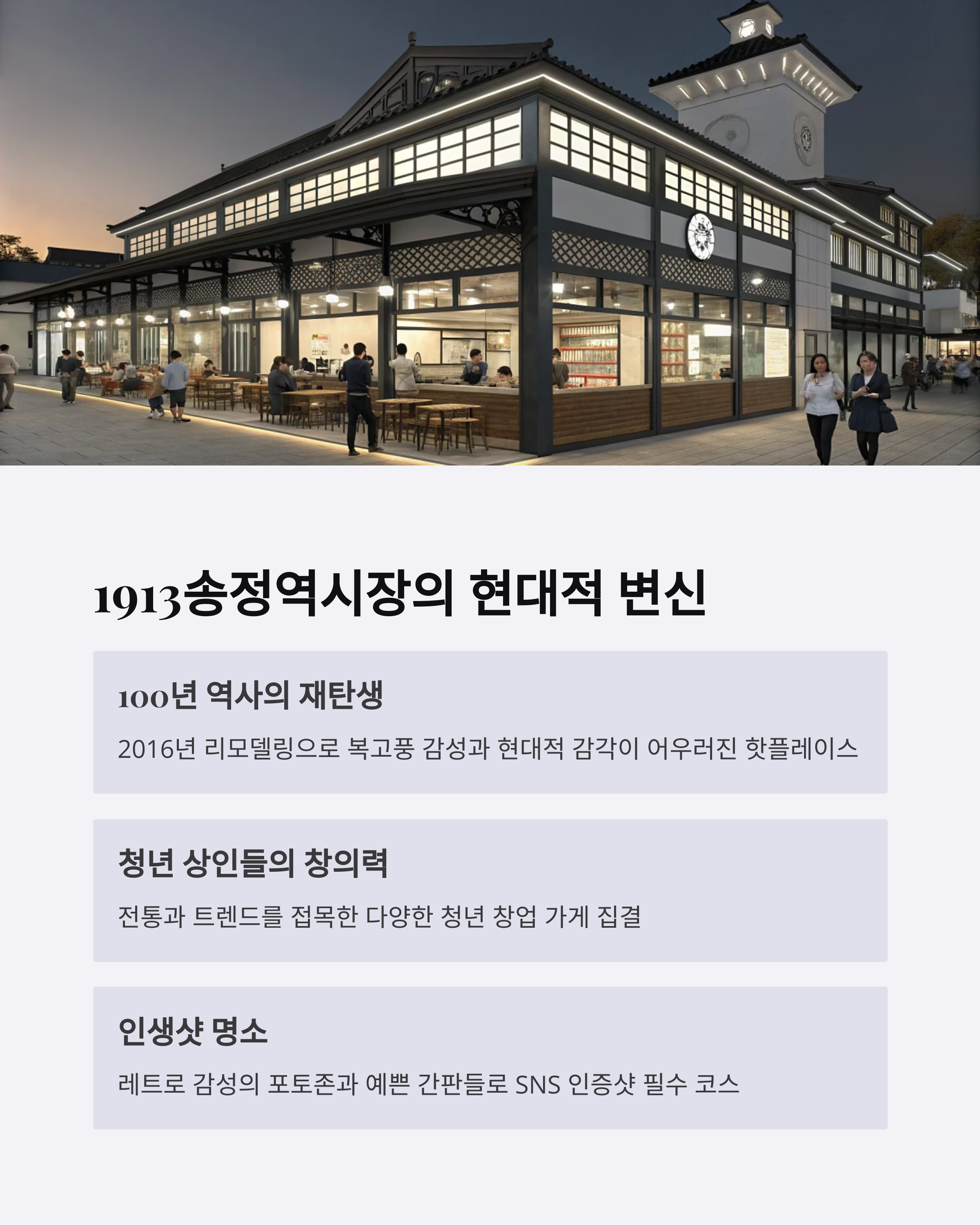 1913송정역시장은 오래된 것을 지키면서도 새로움을 더한 공간이에요. 전통시장의 새로운 모델로 떠오르며, 광주의 감성과 열정을 느낄 수 있는 상징적인 장소랍니다.