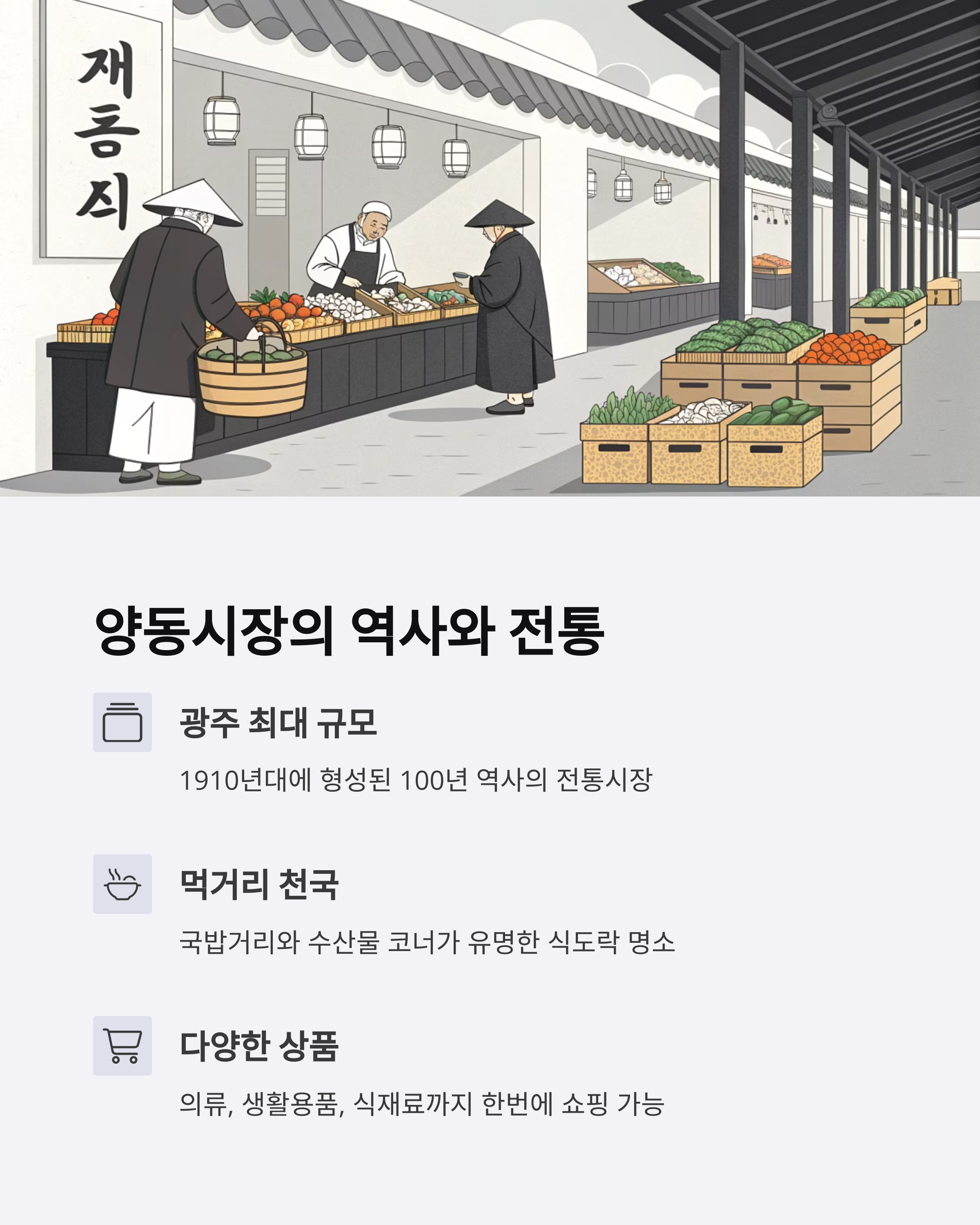 광주에서 가장 대표적인 전통시장이라면 단연 '양동시장'이에요. 이곳은 1910년대에 생겨난 광주의 원도심 중심 상권으로, 현재까지도 많은 사람들이 드나드는 살아있는 역사 현장이에요. 약 700여 개에 이르는 점포가 촘촘하게 밀집해 있어서 장날이면 발 디딜 틈이 없을 정도랍니다.