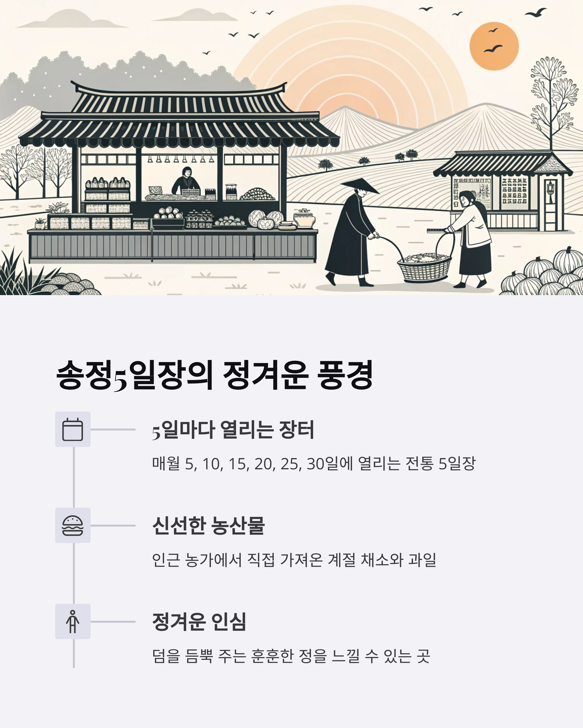 광주 송정동에서는 지금도 매월 끝자리 3과 8일이면 5일장이 열려요. '송정5일장'은 오랜 전통을 자랑하는 장터로, 매 장날마다 수많은 상인들과 주민들이 몰려 활기를 불어넣는 곳이죠. 현대적인 쇼핑몰과는 다른 소박한 매력이 있는 곳이에요.