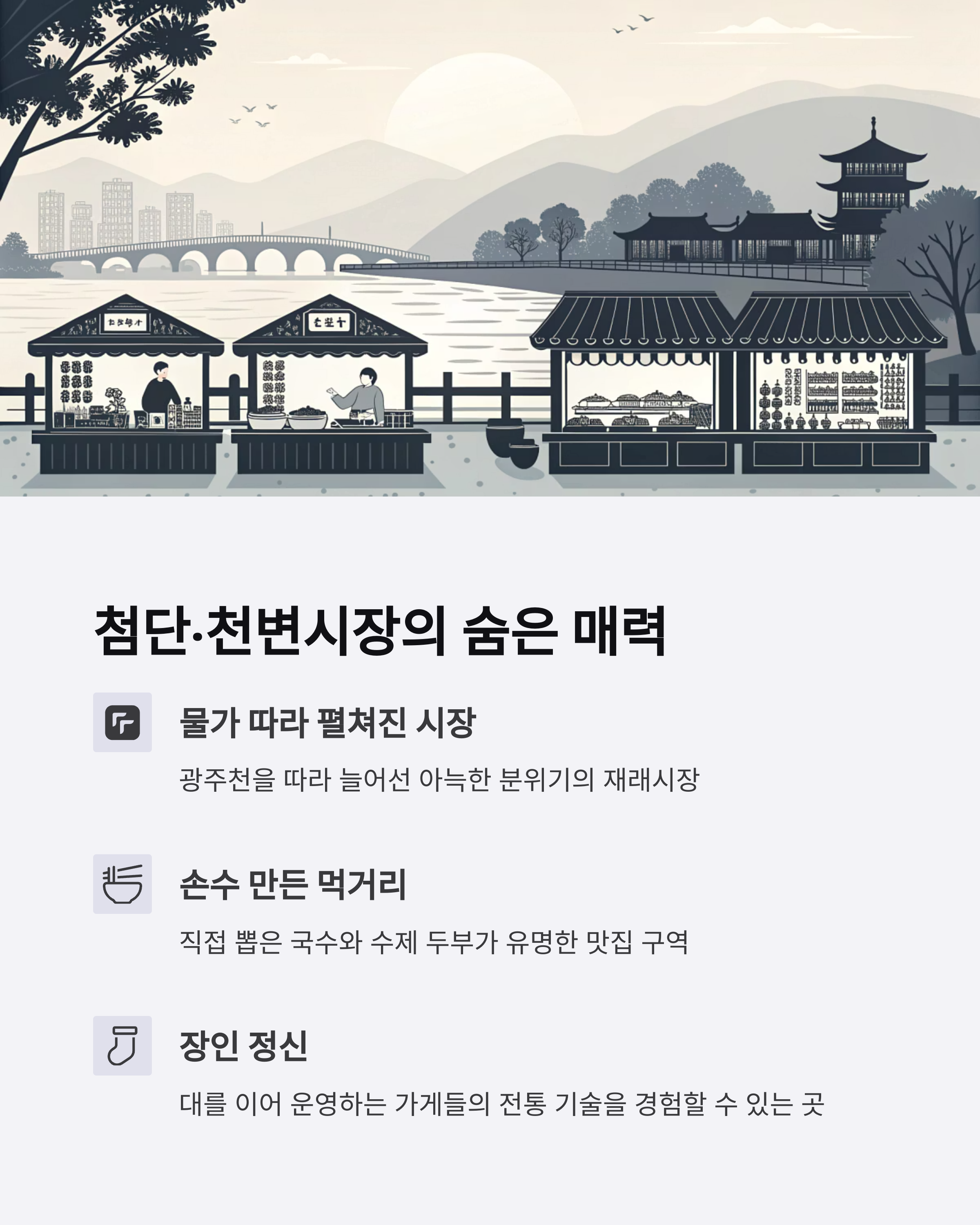 천변시장 인근에는 광주천 산책로가 펼쳐져 있어서 아침 장을 본 후 강바람 맞으며 걸으면 기분이 정말 좋아요. 특히 봄과 가을에는 꽃과 갈대가 어우러져서 사진 찍기에도 딱 좋답니다.