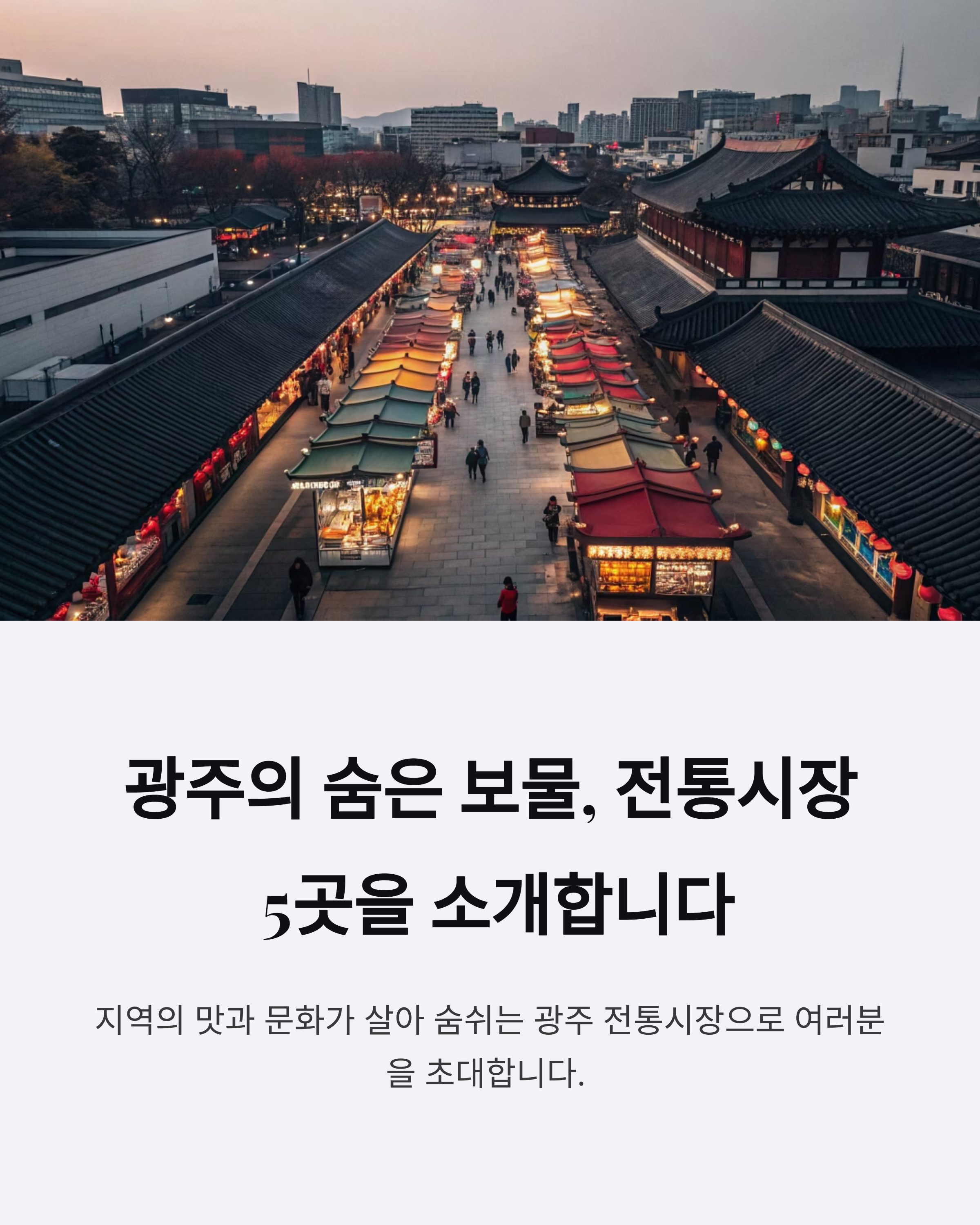 오늘은 광주의 다양한 시장 중에서 현지인과 여행객 모두에게 사랑받는 전통시장 다섯 곳을 소개해볼게요. 각 시장마다 저마다의 특색이 있어서 돌아다니는 재미가 쏠쏠하답니다. 내가 생각했을 때 광주 시장은 특히 음식과 정서적인 풍경이 조화를 잘 이루는 곳 같아요.