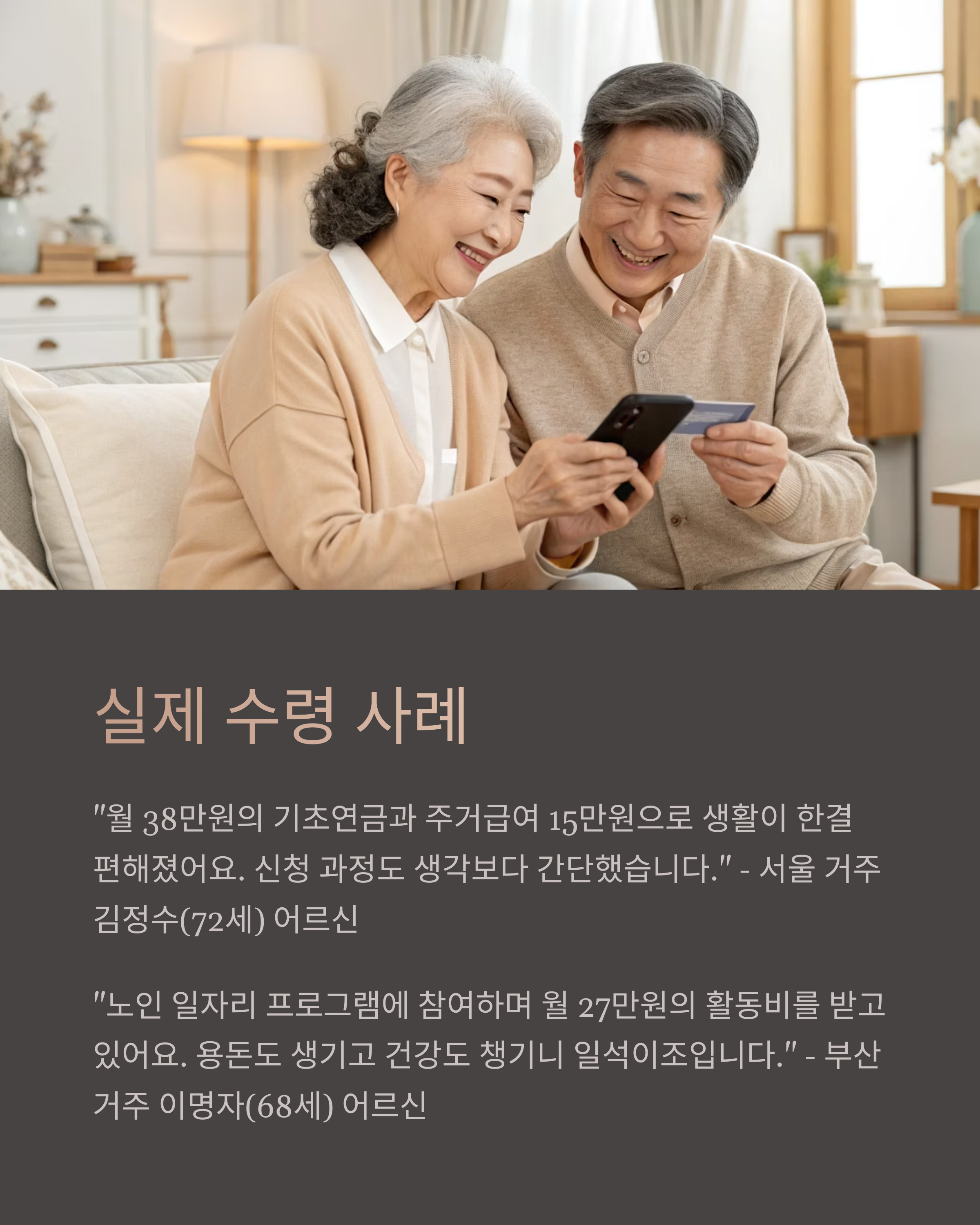 서울에 거주 중인 김영수 어르신(68세)은 기초연금과 주거급여를 합쳐 매달 약 72만 원 정도의 복지 혜택을 받고 있어요. 김 어르신은 "이전엔 기초생활비가 부족해 걱정이 많았는데, 이젠 병원도 가고 음식도 제때 먹을 수 있어요"라고 말했답니다.