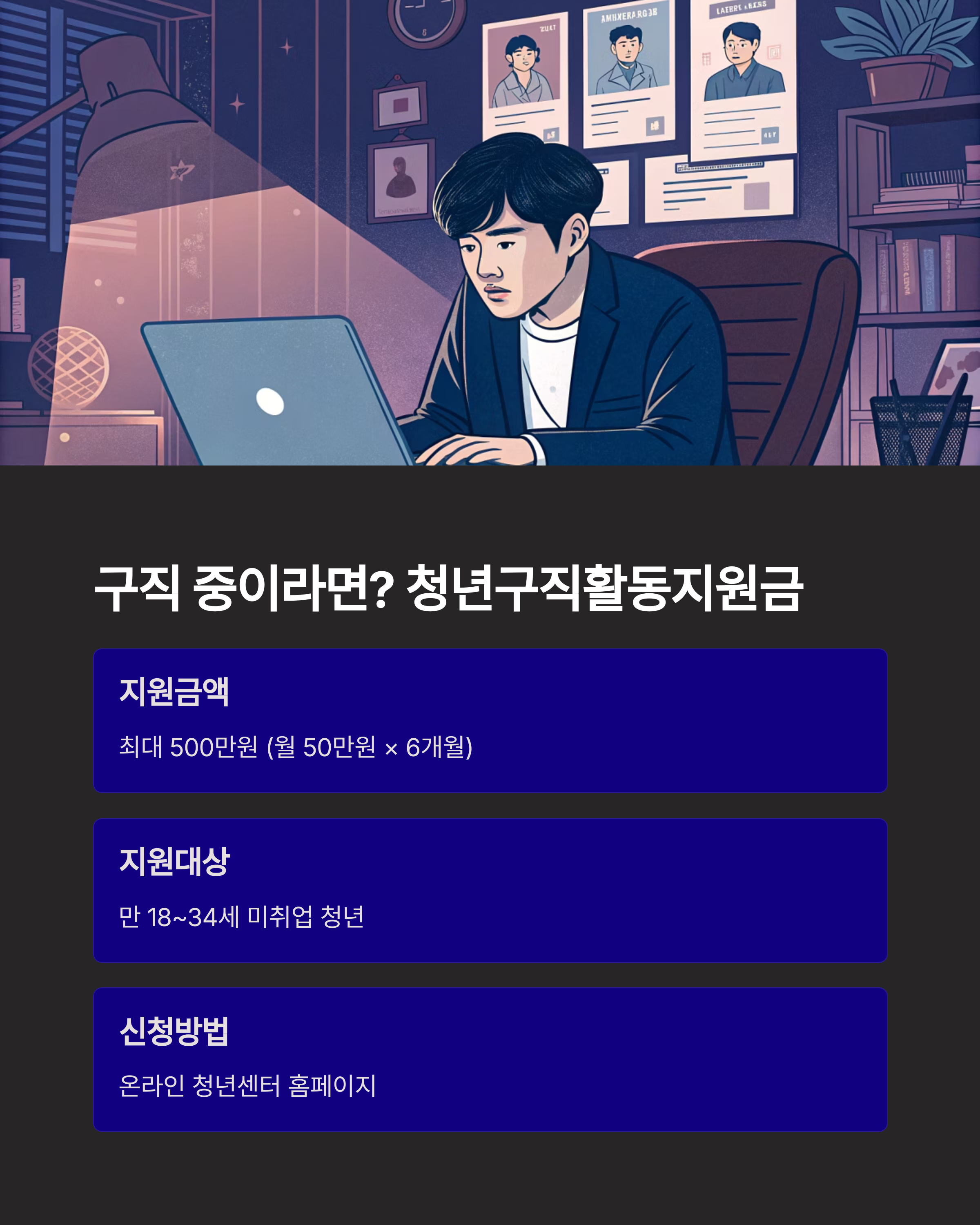 구직 중인 청년이라면 청년구직활동지원금을 절대 놓치면 안 돼요! 만 18세~34세의 미취업 청년에게 월 50만 원씩 최대 6개월간 지원하는 제도로, 총 300만 원을 받을 수 있답니다.