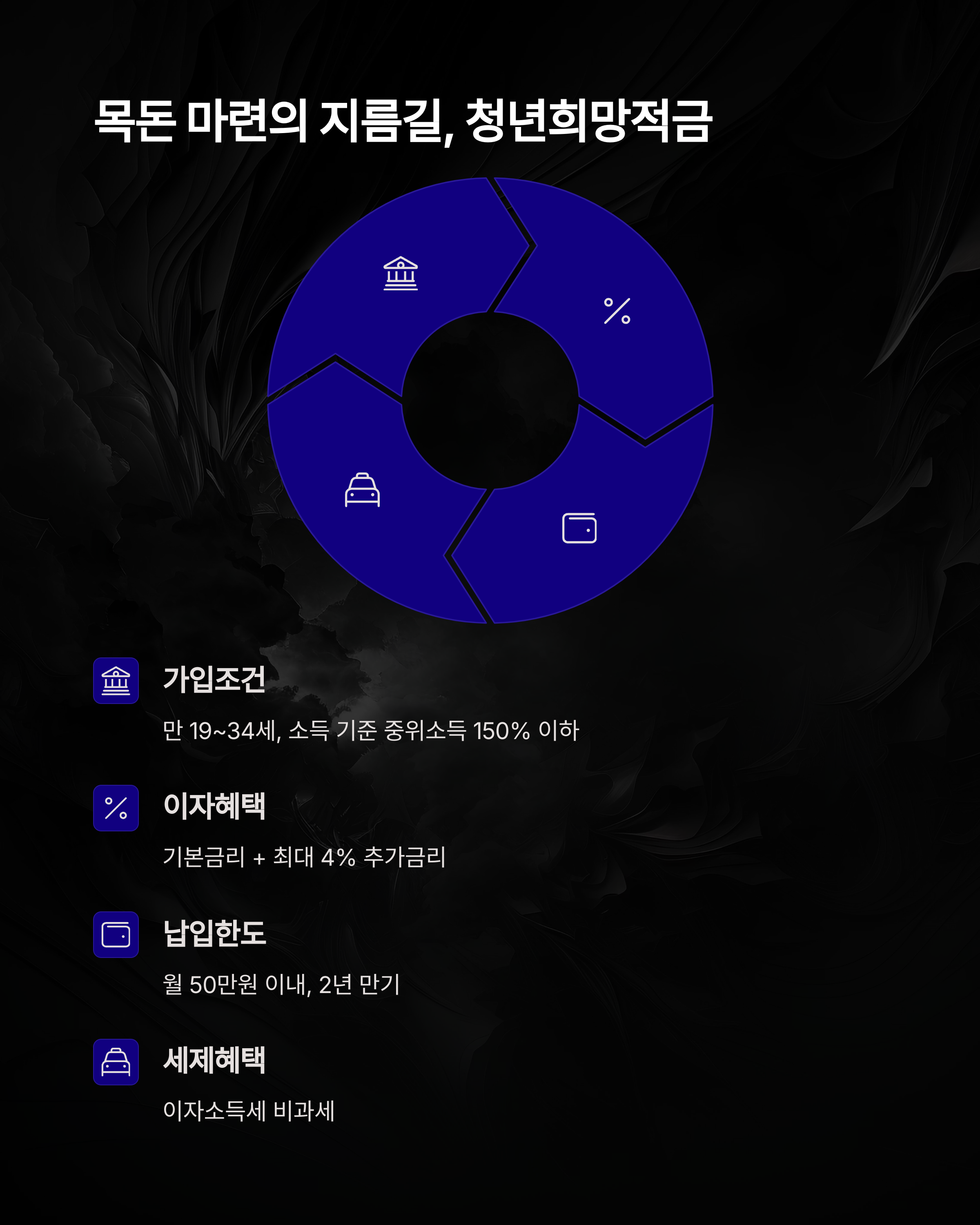 청년희망적금은 저소득 청년의 자산 형성을 돕는 대표적인 금융지원 프로그램이에요. 매달 저축하는 금액에 대해 정부가 이자를 더해주는 형태라서 정말 유리하죠!