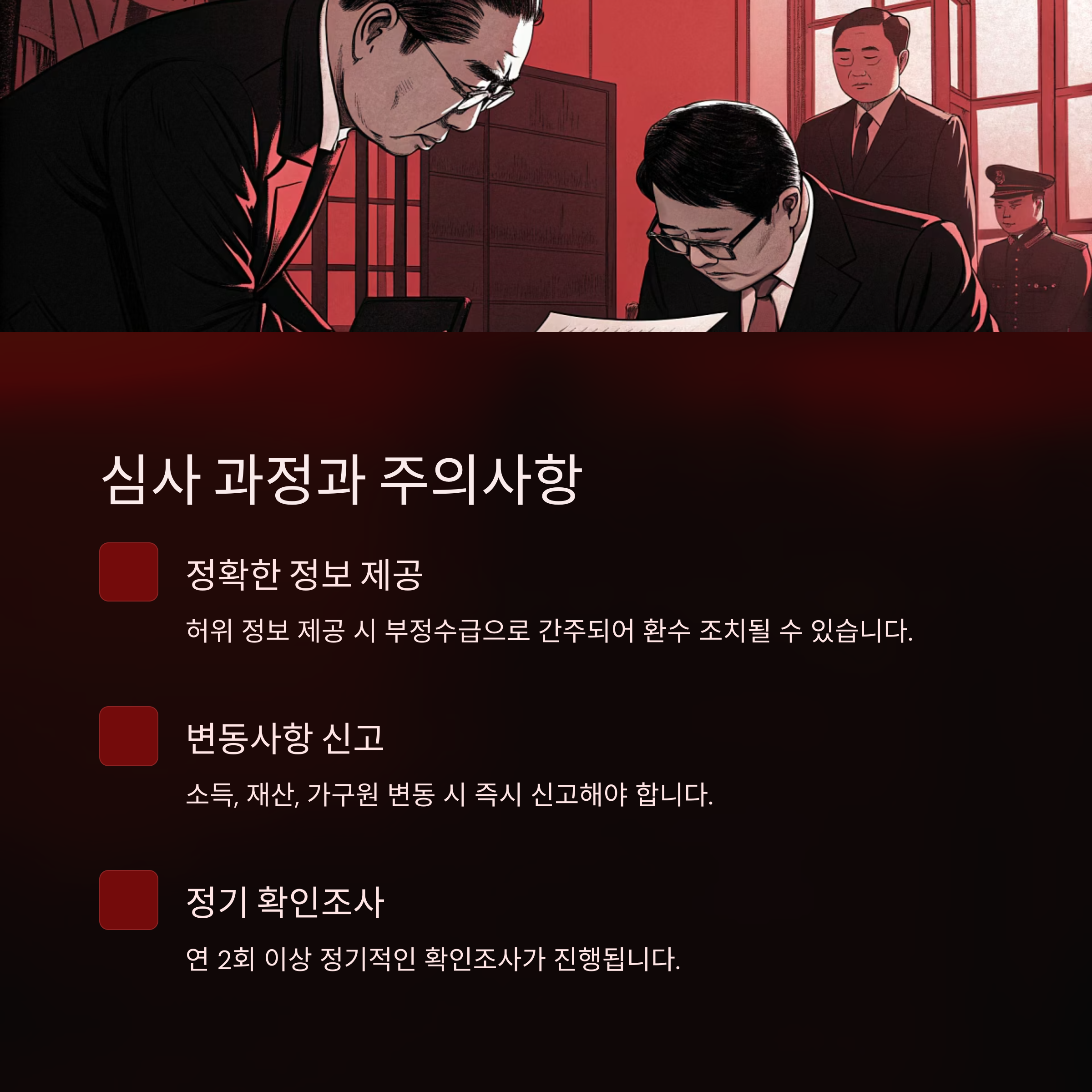 또한 심사과정 중에는 ‘가정방문조사’가 병행돼요. 조사원이 직접 신청자의 거주지를 방문해 실제 거주 여부와 생활환경, 생계 상황을 확인해요. 이때 거짓이나 누락된 정보가 있으면 불이익을 받을 수 있으니 있는 그대로 사실대로 설명하는 게 좋아요.
