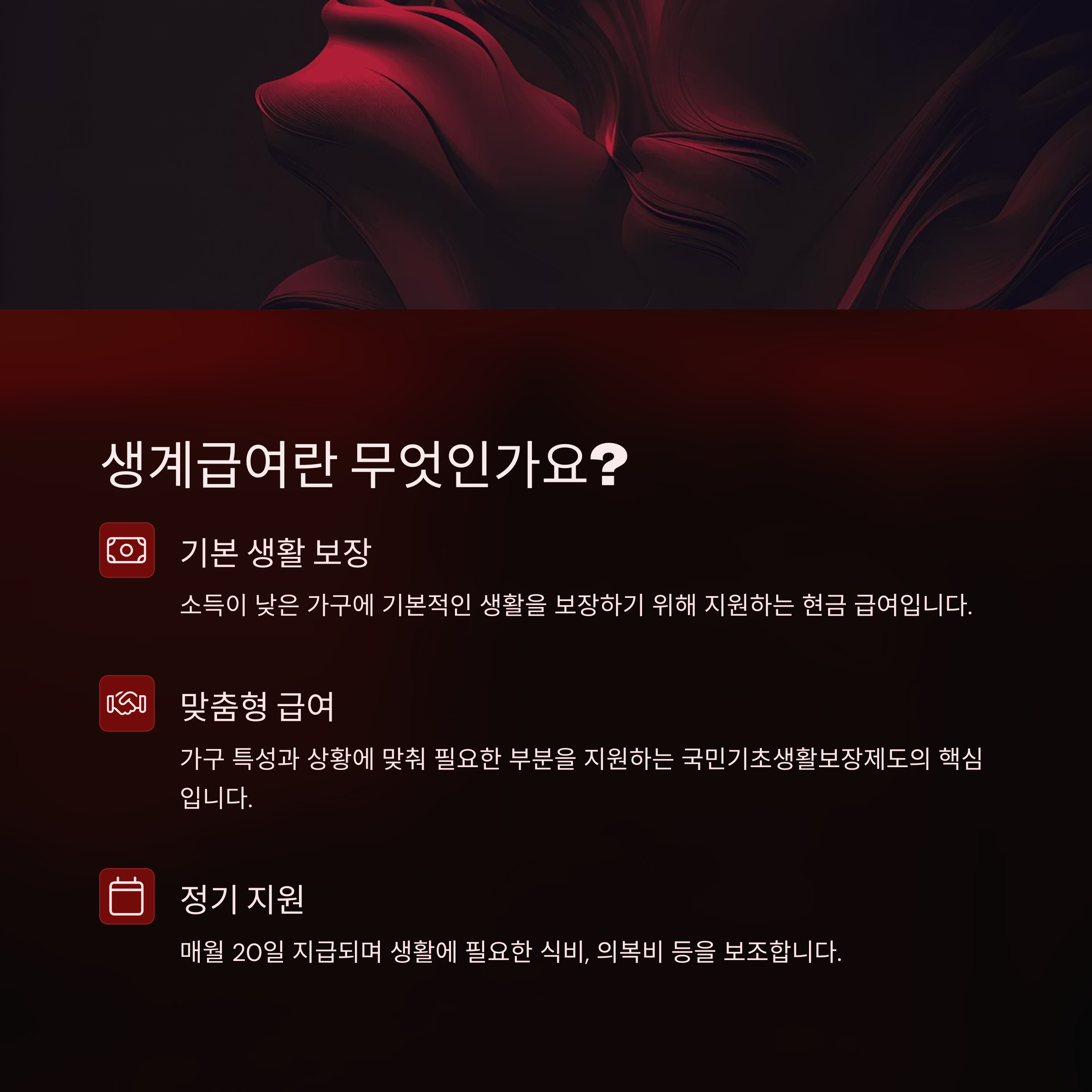 생계급여는 단순한 복지 혜택이 아니라, 사회가 구성원을 포용하고 보호하는 중요한 장치예요. 삶의 기본이 무너지지 않도록 해주는 이 제도는 우리가 함께 지켜가야 할 복지의 기반이에요.