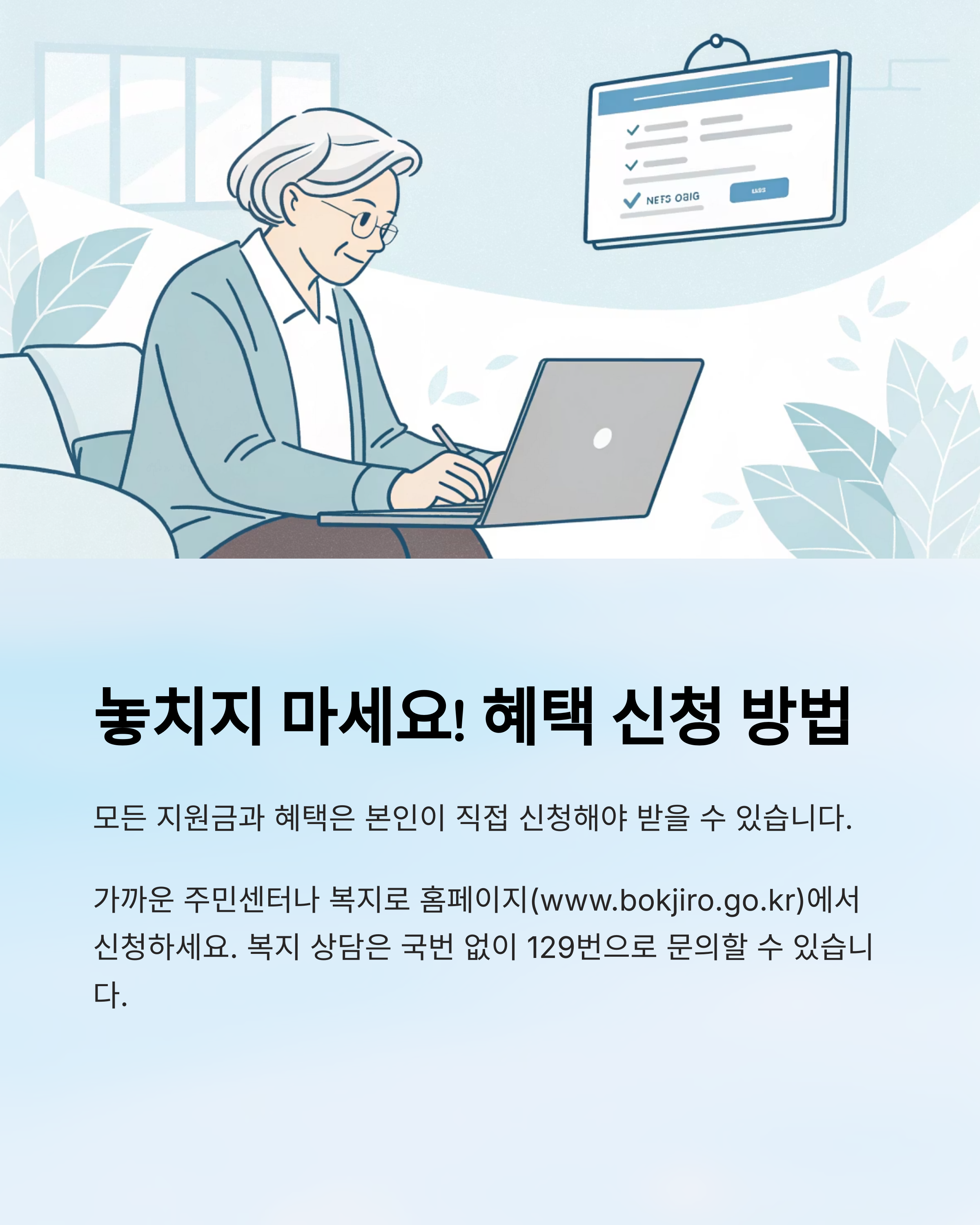 이런 주거 관련 혜택은 보통 ‘복지로’ 사이트나 거주지 주민센터에서 신청할 수 있어요. 조건에 따라 자동 신청되는 경우도 있지만, 대부분은 본인이 직접 신청해야 해요. 꼭 잊지 말고 챙겨야 해요!