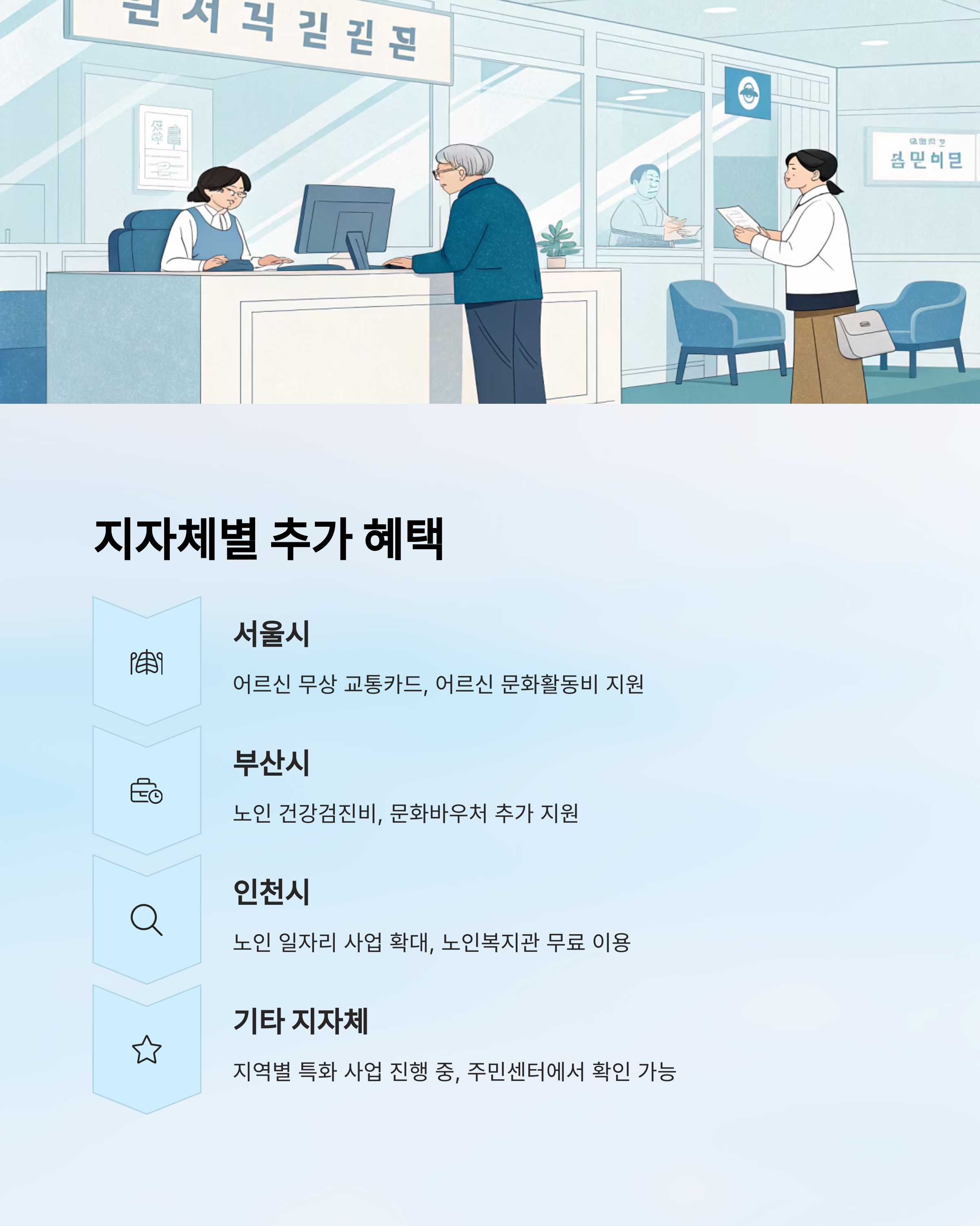 부산시의 경우 ‘부산 어르신 교통카드’가 있어요. 월 20회까지 무료 탑승이 가능하며, 도시철도와 시내버스에 모두 적용돼요. 이 외에도 무료 건강검진, 안과검진 바우처 등도 제공하고 있어요.