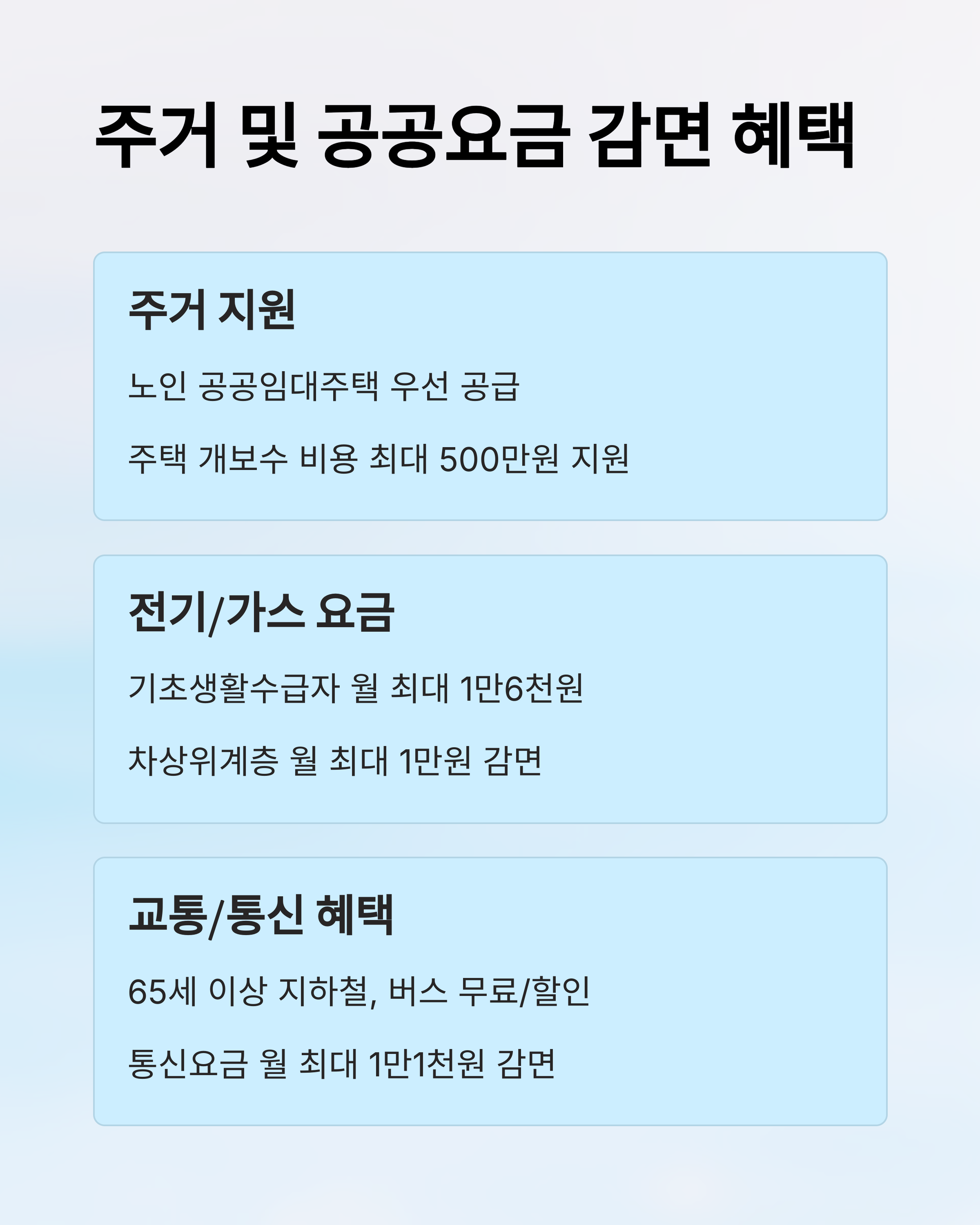 | 전기·가스·수도요금 감면 | 최대 50% 할인 | 기초수급자 또는 만 65세 이상 |