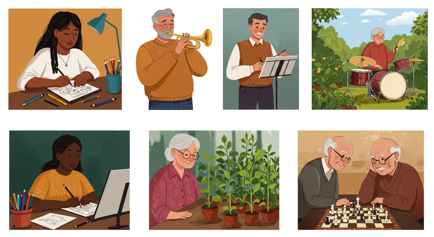 60대 이후 가장 중요한 삶의 동력 중 하나는 바로 '취미'예요! 이제는 경제적 책임에서 조금씩 벗어나 자기 시간을 온전히 가질 수 있는 시기니까, 그 시간을 즐겁고 의미 있게 보내는 게 중요해요. 예전에는 바빠서 못 했던 그림 그리기, 악기 연주, 글쓰기 같은 것들을 다시 시작해볼 수 있어요.