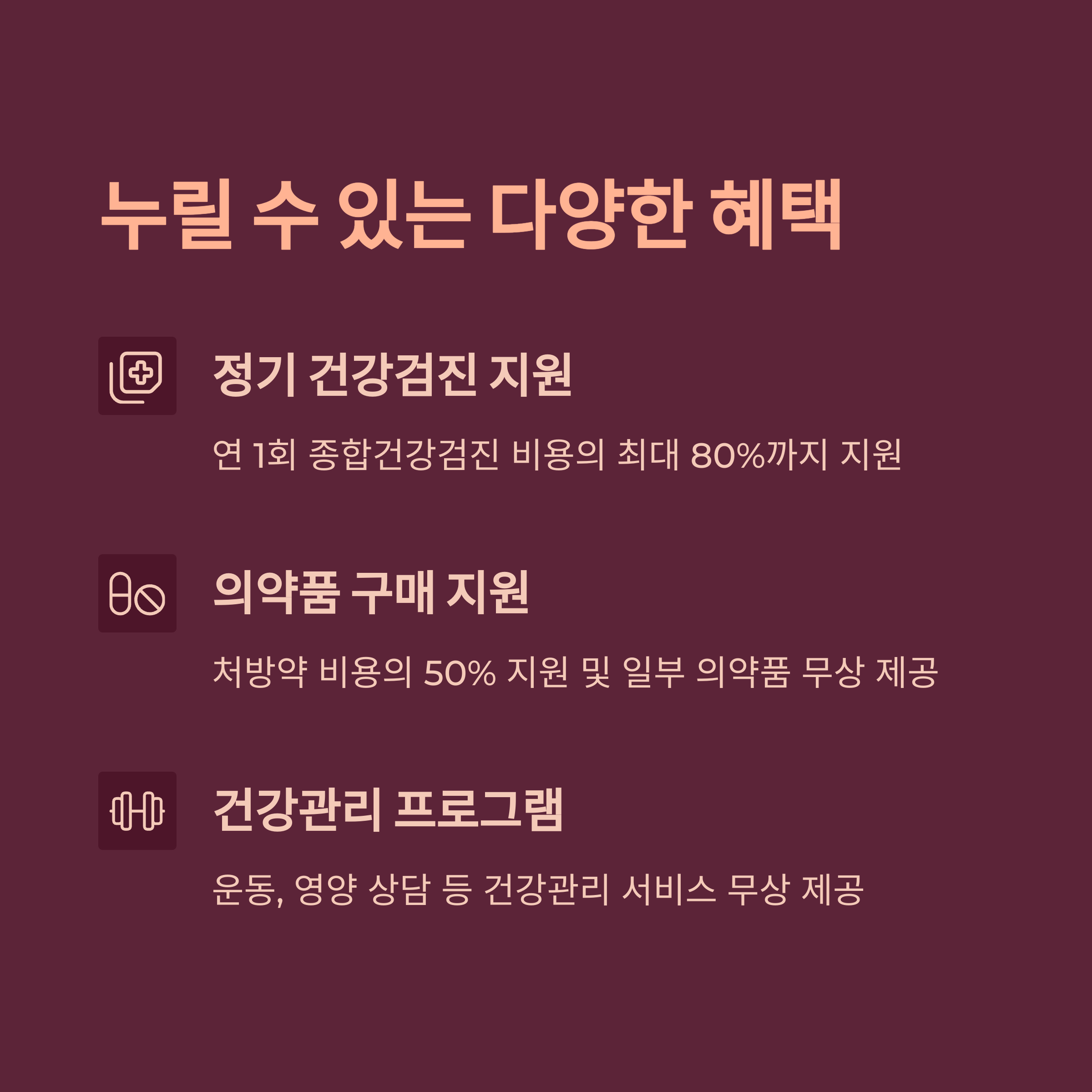 가장 널리 알려진 혜택은 ‘정기 건강검진 지원’이에요. 보통은 2년에 한 번씩 받는 건강검진인데, 이 제도를 통해 무료 또는 매우 저렴한 비용으로 받을 수 있답니다. 고혈압, 당뇨 같은 질환도 조기에 발견할 수 있으니 적극적으로 이용해보세요!
