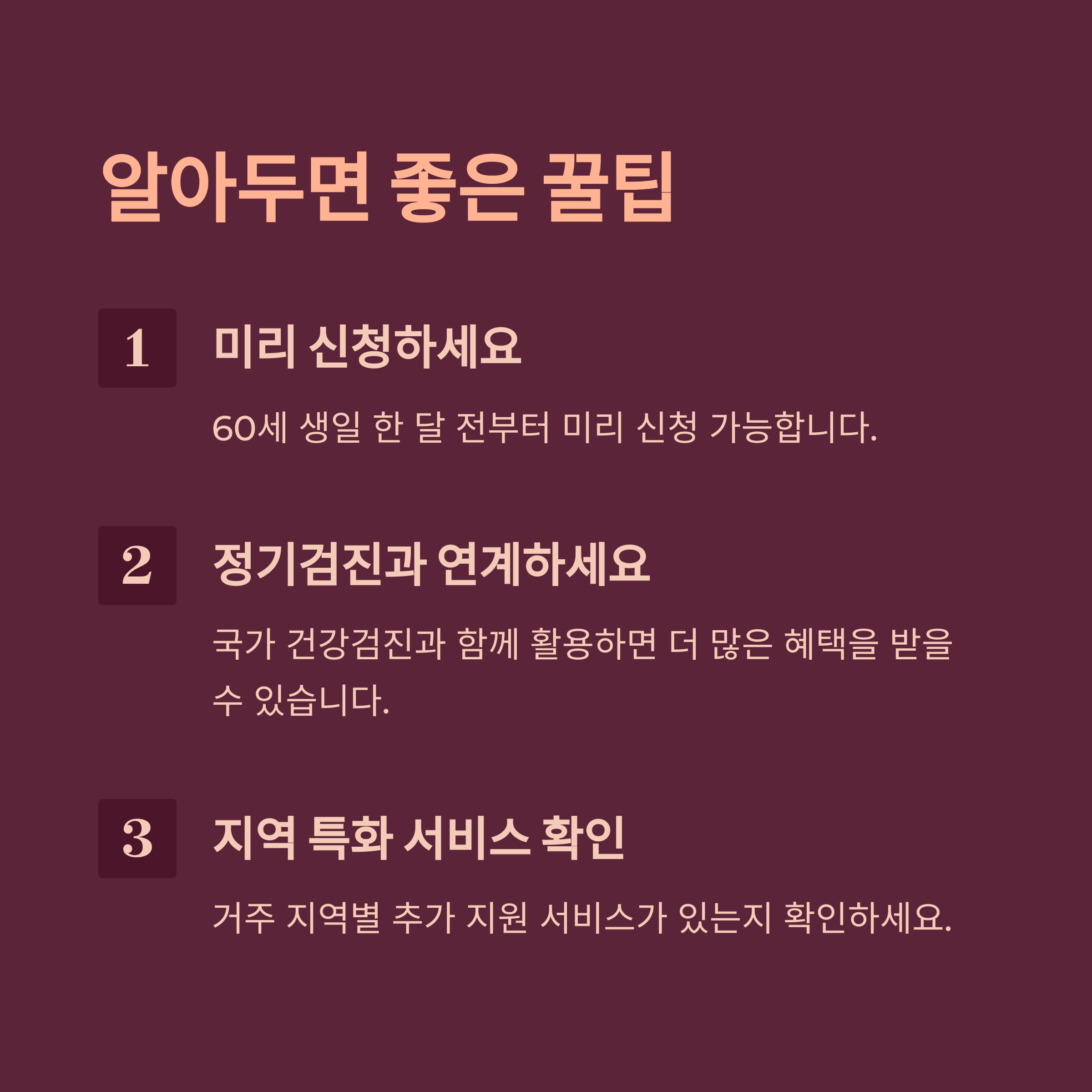 이처럼 60대 건강지원금 제도는 단순 복지를 넘어, 삶의 질을 높이고 노후 건강을 지키는 든든한 장치로 자리 잡고 있어요. 병원비가 무서워 병을 키우는 일 없이, 이 제도를 잘 활용하면 훨씬 더 건강한 노후를 준비할 수 있어요.