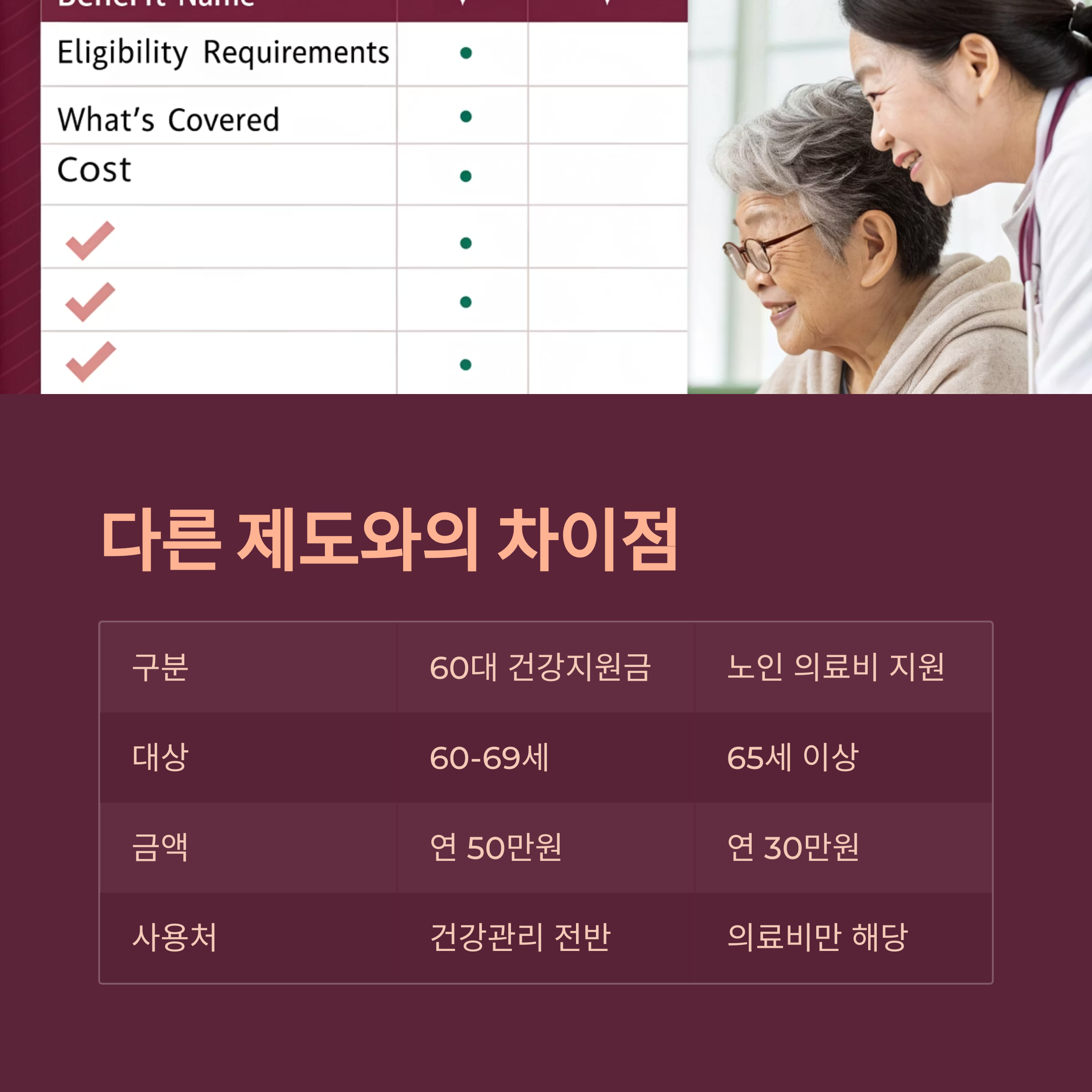 건강지원금 제도는 기본적으로 '경증 질환자'나 '일상생활은 가능한 건강 상태'를 유지하는 60대 이상에게 실질적인 의료비 부담 완화를 지원하는 게 핵심이에요. 반면 장기요양보험은 중증 질환이나 노쇠 상태인 분들을 대상으로 한 ‘돌봄’ 중심 제도예요.