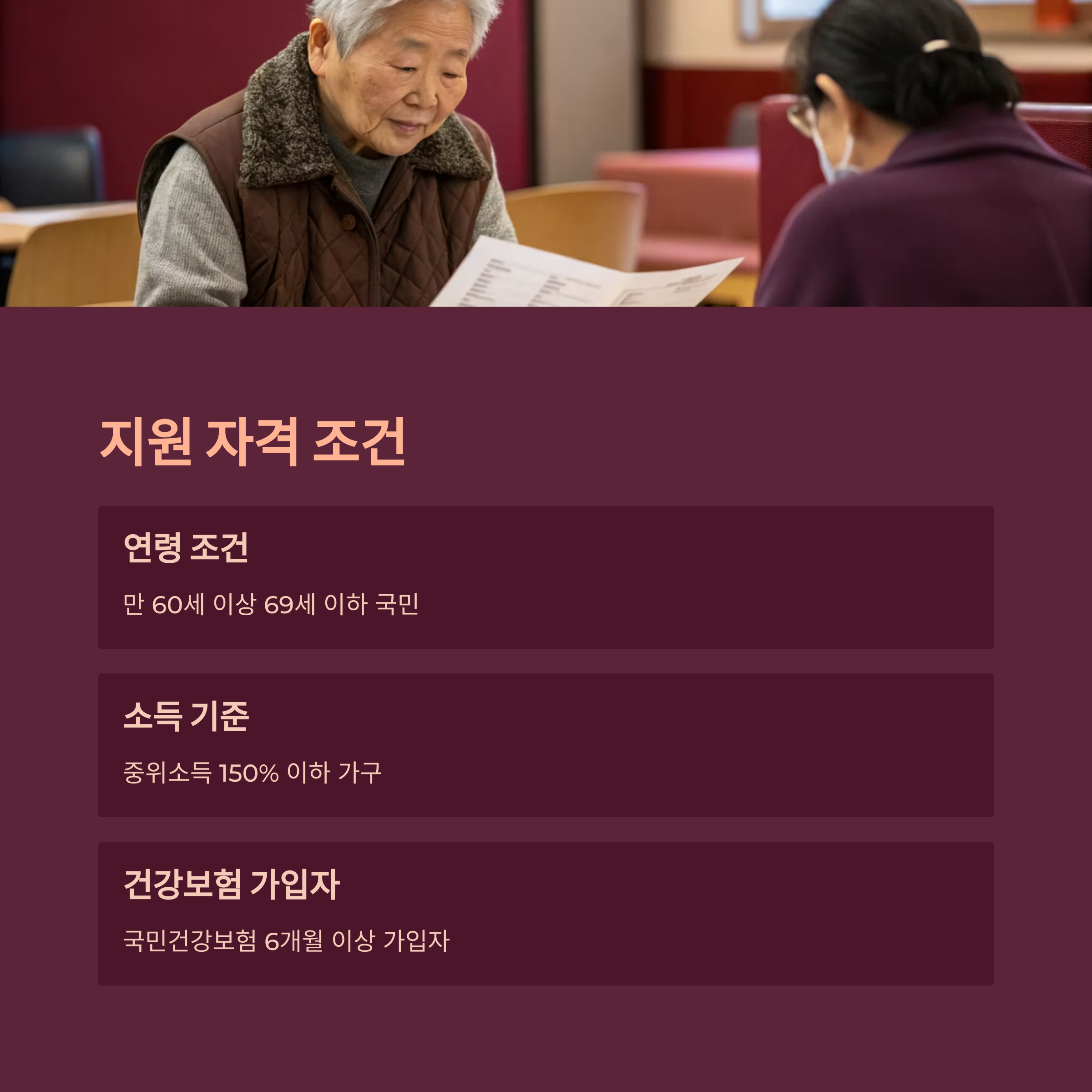 60대 건강지원금 제도는 일정 기준을 충족한 만 60세 이상 국민이라면 누구나 신청 가능해요. 하지만 기본적으로 ‘소득’과 ‘건강 상태’ 두 가지를 중심으로 지원 대상이 나뉘어요. 단순히 나이만 넘었다고 무조건 되는 건 아니니 조건을 꼼꼼히 확인해야 해요.