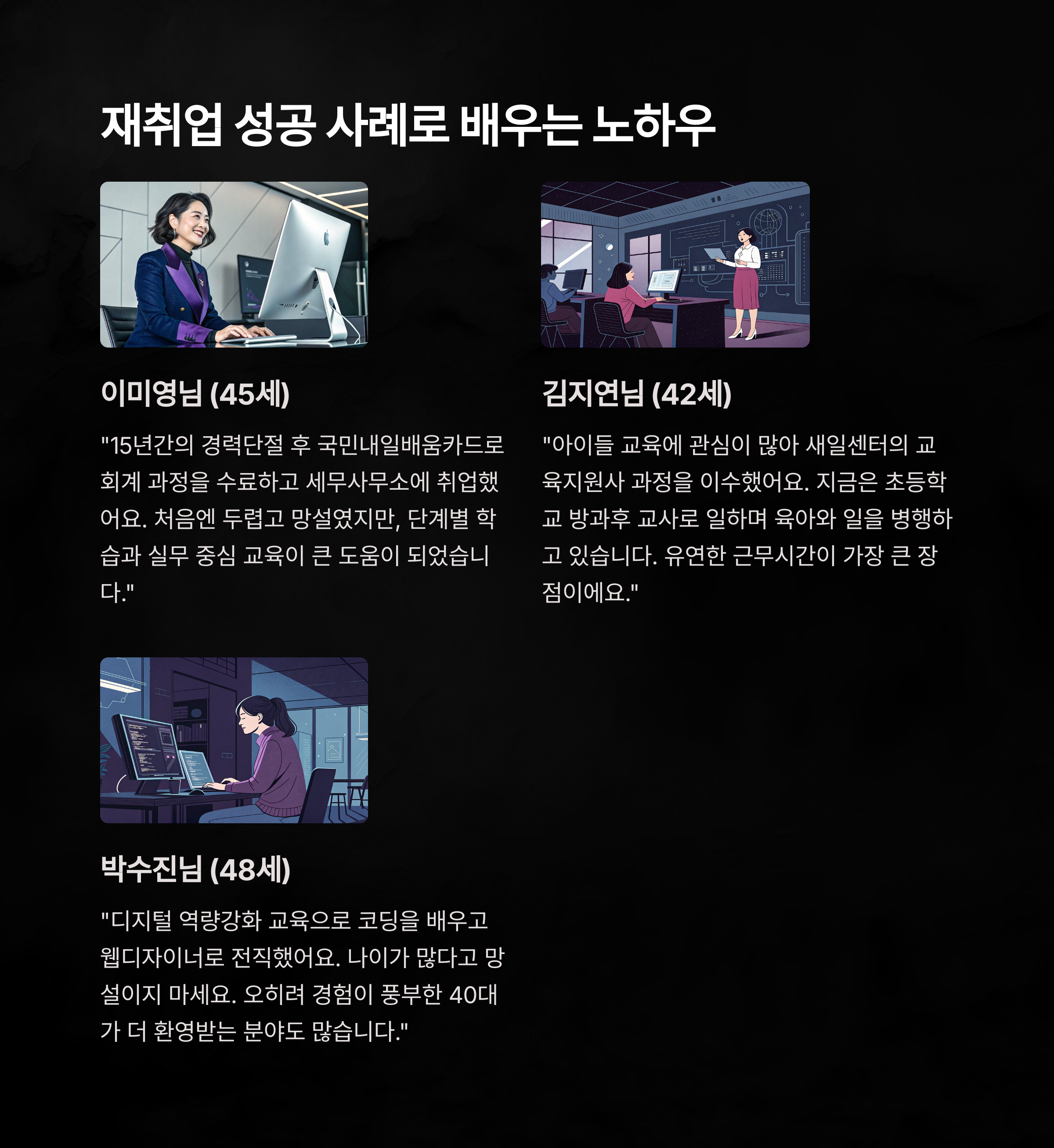 두 번째는 전북 전주에 사는 정윤화(가명) 씨예요. 이분은 15년간 전업주부로 살다가 다시 사회로 나가고 싶다는 생각에 국민취업지원제도를 신청했어요. 회계 실무 과정을 수료하고, 현재는 세무회계 사무소에서 근무 중이에요. 그녀는 “처음엔 떨렸지만, 도전하길 잘했다”고 말했어요.