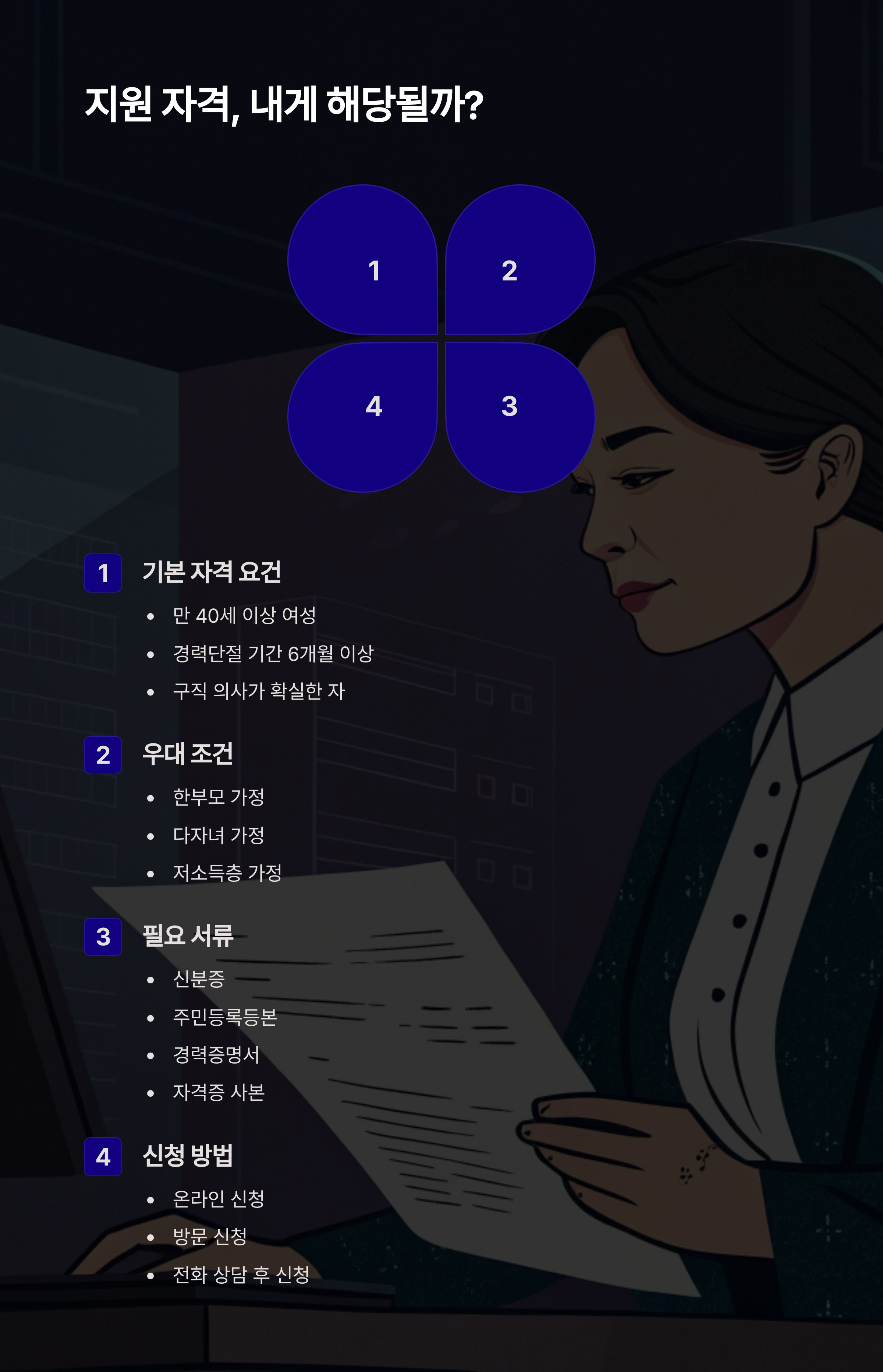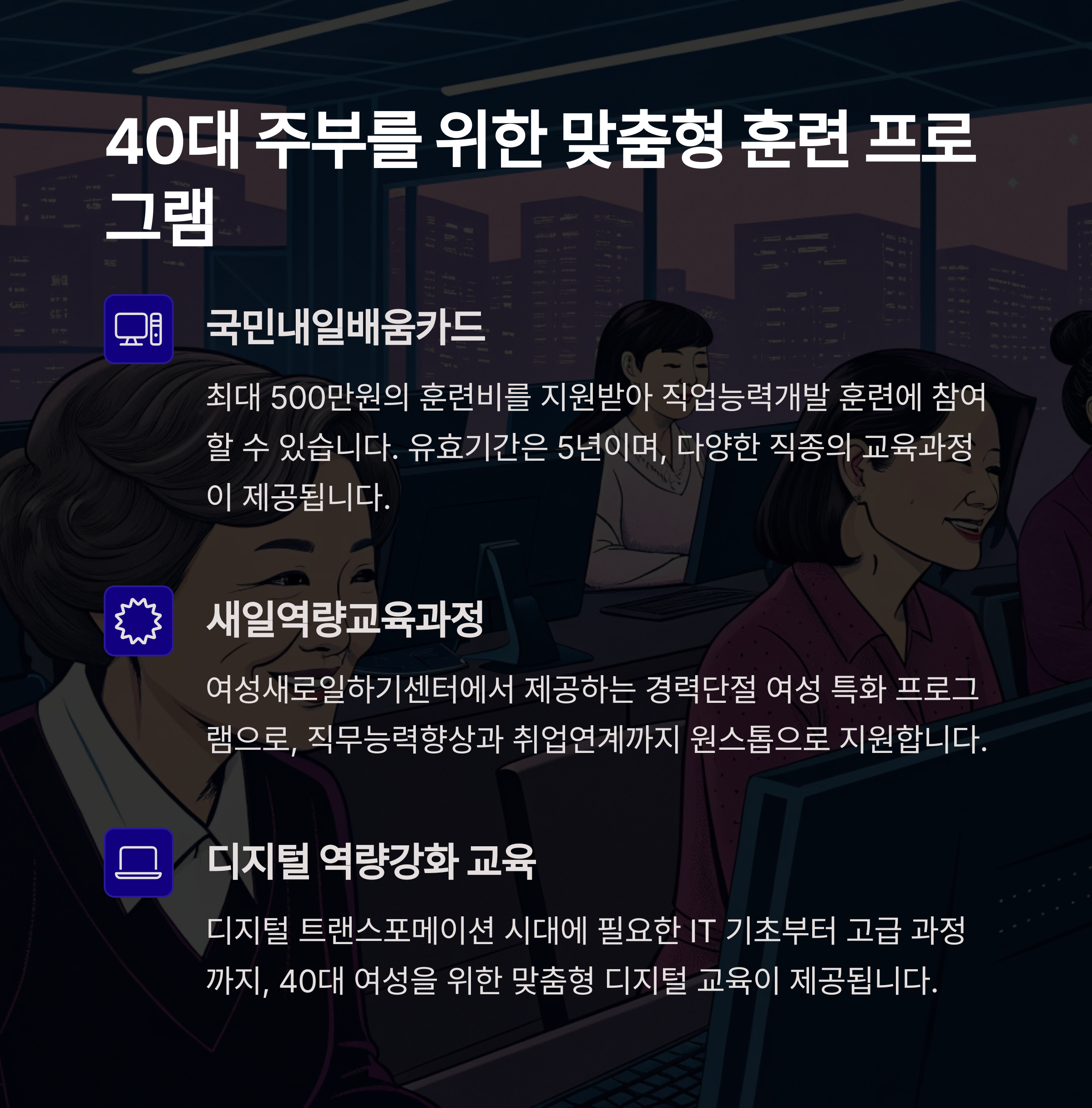 관련 태그: 재취업, 40대여성, 내일배움카드, 경력단절, 새일센터, 국민취업지원제도, 생활비지원, 직업훈련, 온라인수업, 취업성공