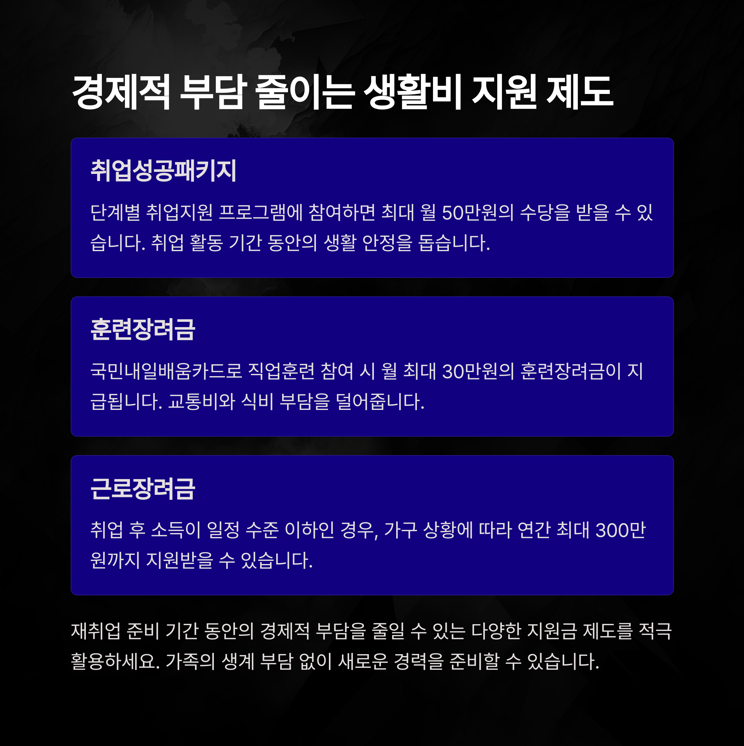 | 2023년 | 생활비 지원 포함 | 직업훈련 참여 시 매월 30~50만 원 지급 |