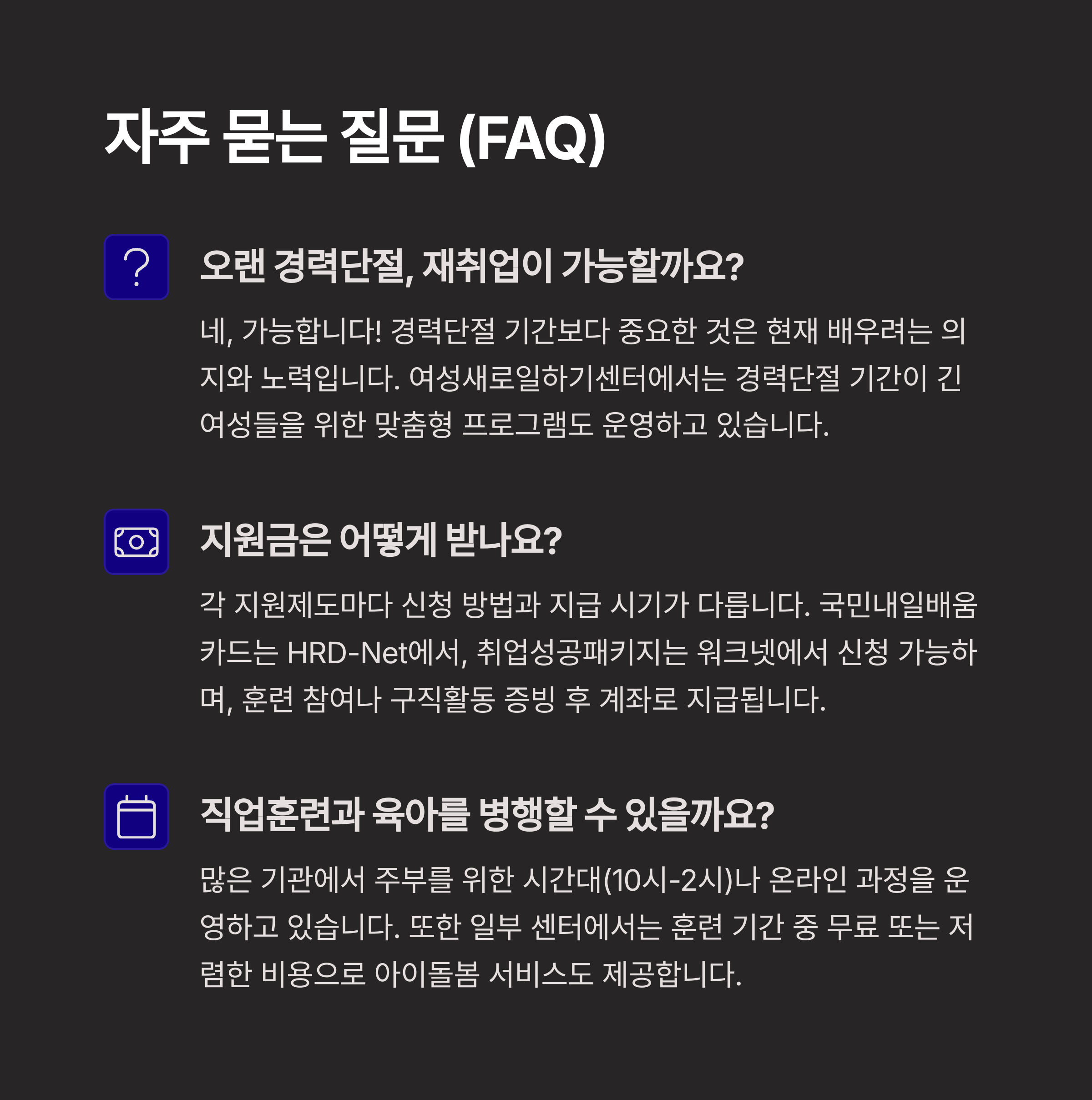 이제는 단순한 기술 습득을 넘어서, 자기계발과 사회적 연결망을 만드는 기회로 자리 잡은 재취업 지원 프로그램! 집안일만 하던 일상에서 한 발짝 나와보는 첫걸음으로 이만한 제도는 없답니다.
