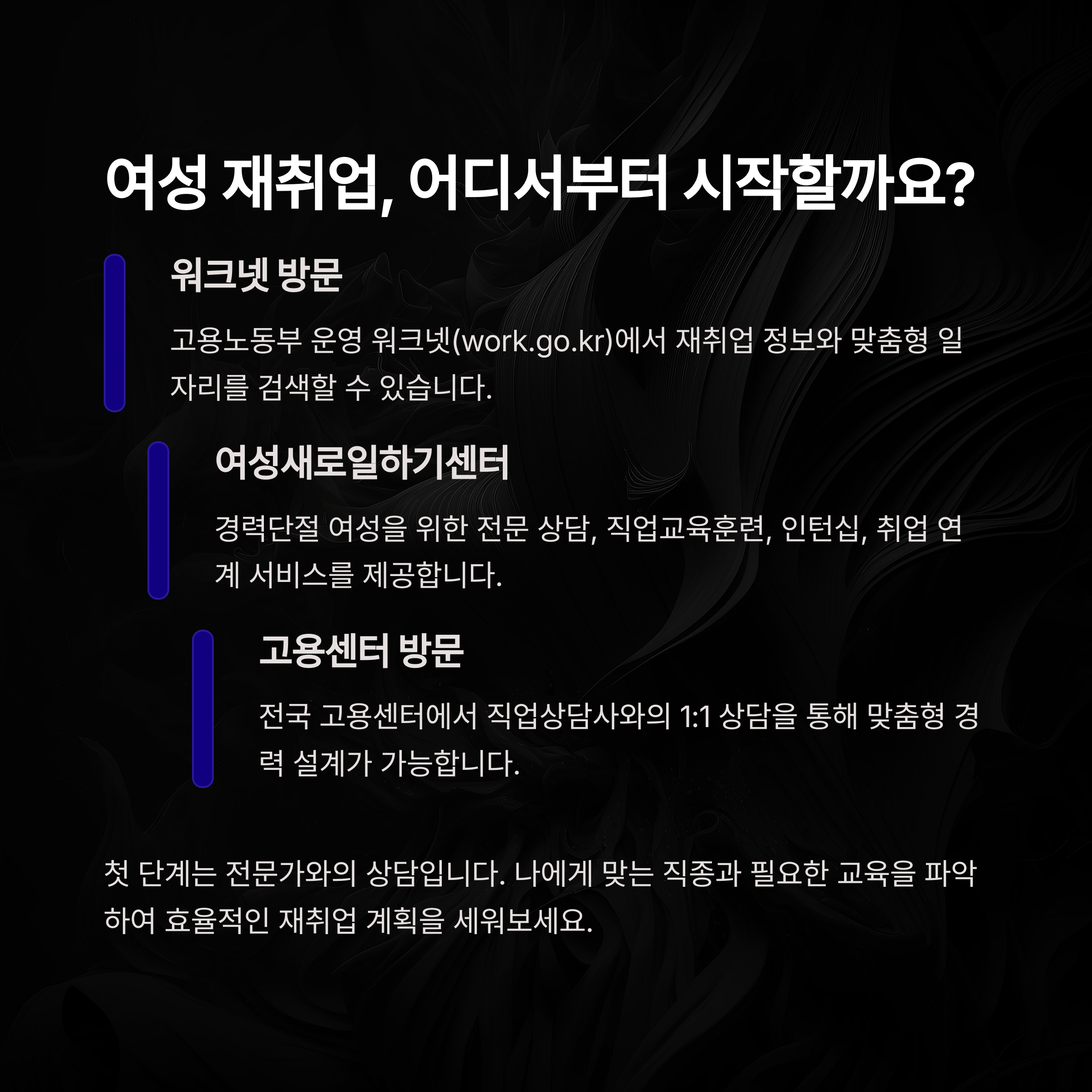 가장 먼저 해야 할 일은 ‘내일배움카드’나 ‘국민취업지원제도’ 중 어떤 제도를 활용할지를 결정하는 거예요. 이를 위해 가까운 고용센터나 새일센터를 방문해서 1:1 상담을 받아보는 게 좋아요. 상담을 통해 개인 상황에 가장 잘 맞는 제도를 추천받을 수 있어요.