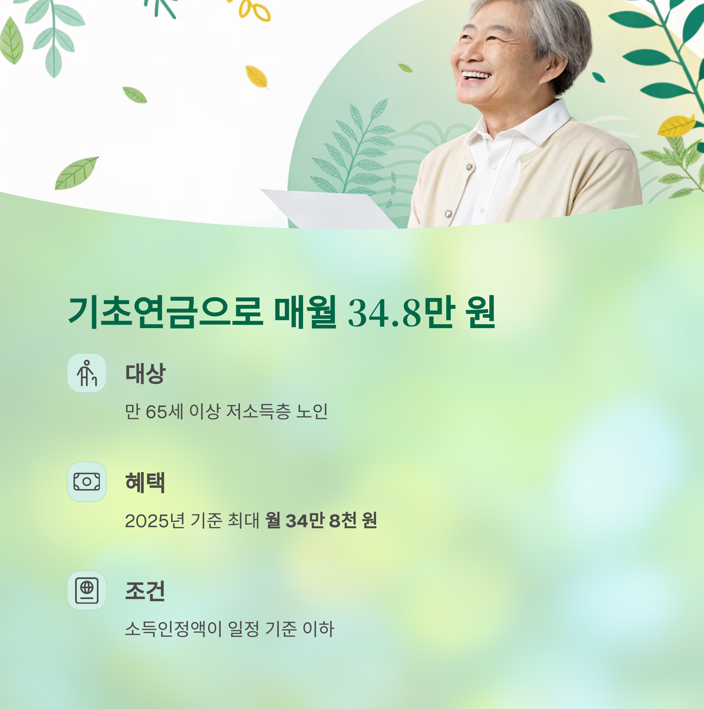 | 기초연금 | 최대 34만 8천 원 | 만 65세 이상, 소득하위 70% 이하 |