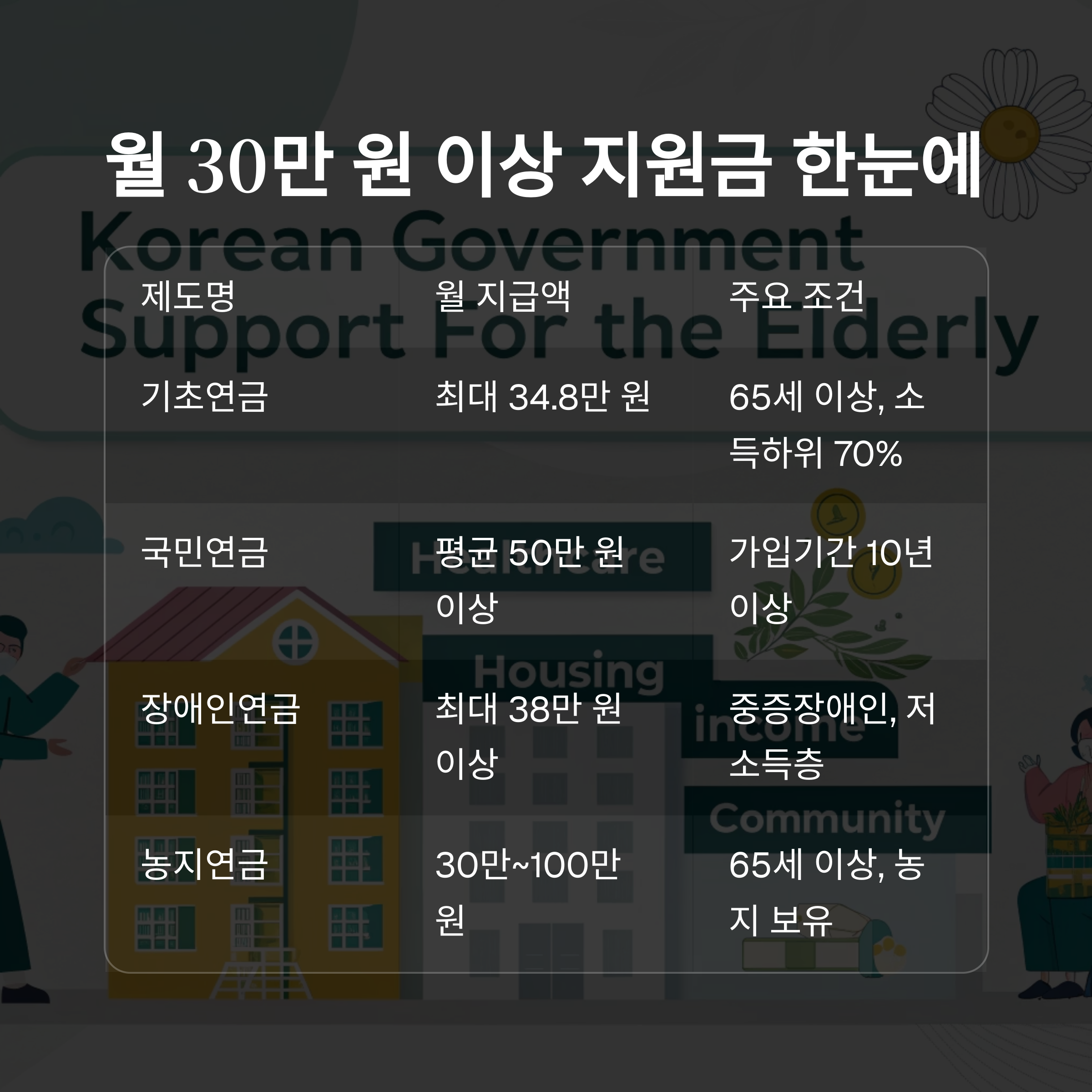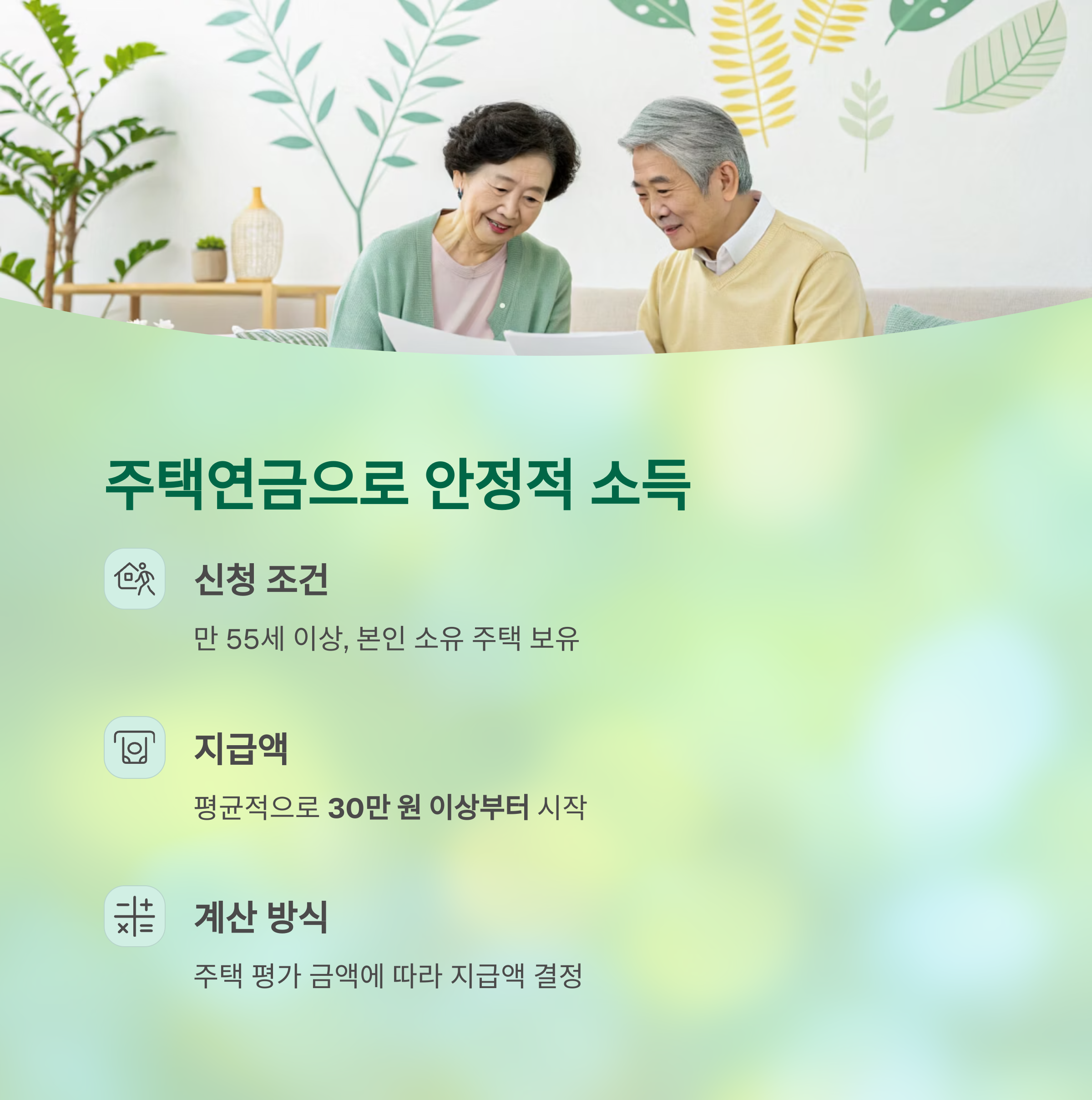 | 주택연금 | 30만 원 이상 | 만 55세 이상, 자가주택 보유 |